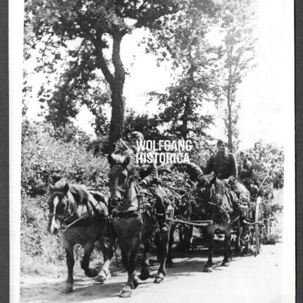 Taken during the Battle of Normandy (Summer 1944), this image documents the logistical efforts of German forces during the Allied invasion of France. Press photos such as this were distributed through the Heinrich Hoffmann agency, the primary outlet for official Wehrmacht and propaganda imagery, making this an authentic example of wartime German photojournalism.