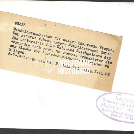 “Munitionsnachschub für unsere kämpfende Truppe. Gut getarnt fahren unsere Munitionswagen durch das unübersichtliche Wald- und Buschgelände der Normandie nach vorn, um unseren Grenadieren die zur Abwehr der Invasion notwendige Munition zu bringen.”