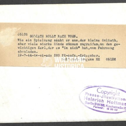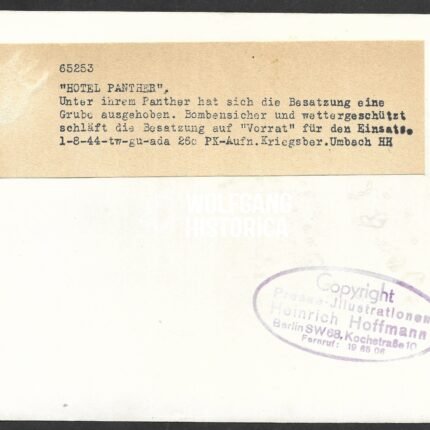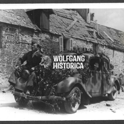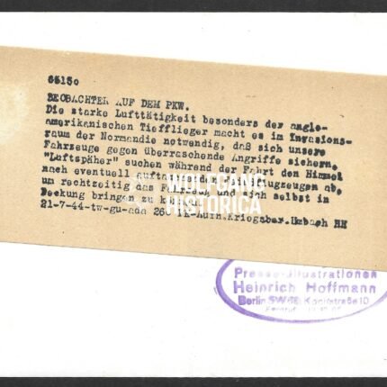Original Heinrich Hoffmann press photos from the Normandy campaign are increasingly scarce. This image, with its complete typed caption slip and clear agency stamp, offers excellent provenance and represents a striking piece of WWII frontline documentation. Ideal for collectors of Wehrmacht, Western Front, and propaganda photography.