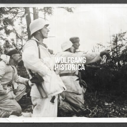 €0,01Original wartime photograph showing a group of Waffen-SS and Wehrmacht officers gathered in discussion in an outdoor setting, likely during operations on the Eastern Front. The central figure, collector-attributed as SS-Gruppenführer Felix Steiner, can be seen wearing a Knight’s Cross (Ritterkreuz) around his neck, speaking with field officers in standard combat attire. Several soldiers stand nearby, listening attentively, indicating a briefing or inspection taking place close to the front.