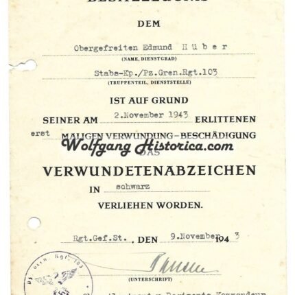 Wound Badge in Black Award Document – Pz.Gren.Rgt.103 (14.Pz.Div.)