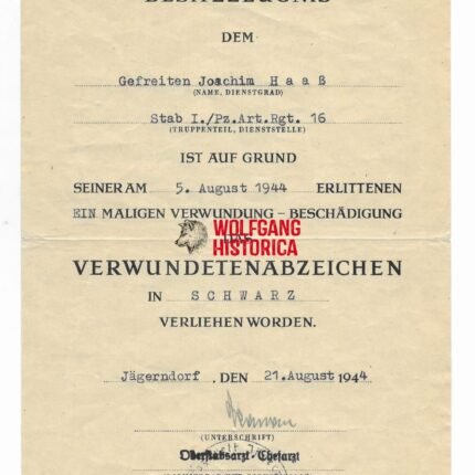 Wound Badge in Black Award Doc: Panzer-Artillerie-Regiment 16 (16. Panzer-Division)