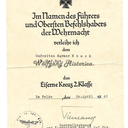 Iron Cross 2nd Class Award Document – Infanterie-Regiment 270 (93.Inf.Div.)