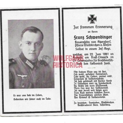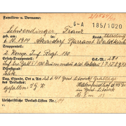 Death Card: KIA June 22, 1941 at Brest-Litowsk (Inf.Rgt.130, 45.Inf.Div.)