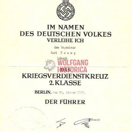 War Merit Cross 2nd Class Award Doc – Awarded January 1945!