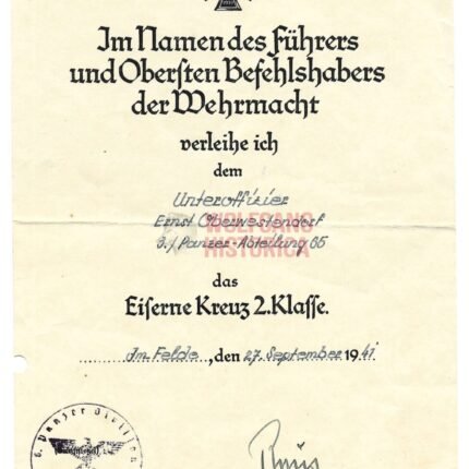 Iron Cross 2nd Class Award Doc: Panzer-Abteilung 65 (Signed by Erhard Raus)