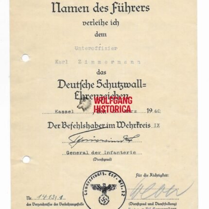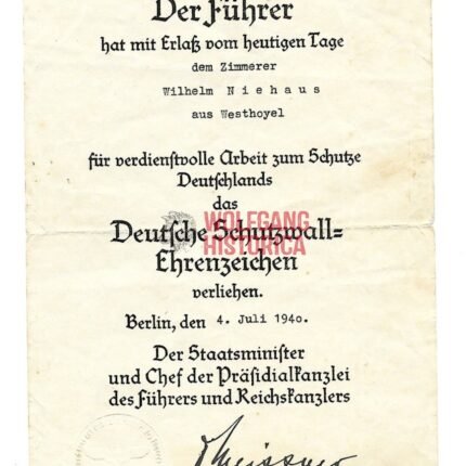 Deutsche-Schutzwall Ehrenzeichen – Westwall Medal Award Doc