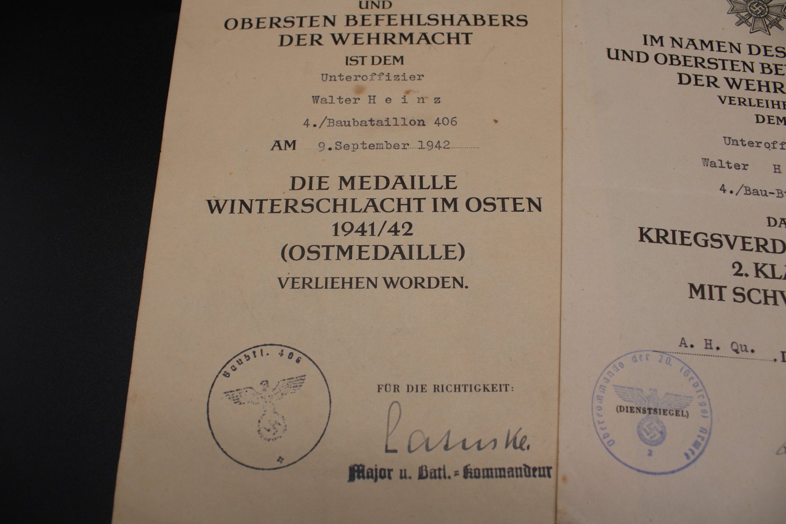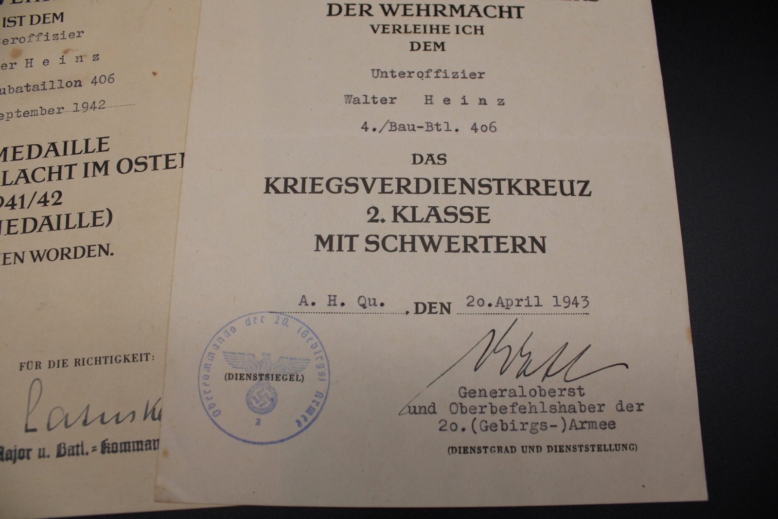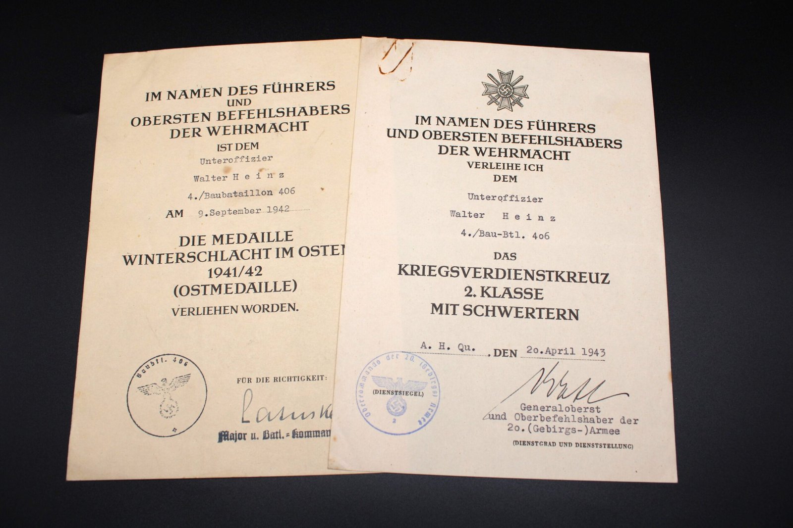 Original set of 2x Award documents (and extra documents not photographed) of Unteroffizier Heinz, who served with the Bau-Bataillon 406 under the 20. Gebirgs-Armee.