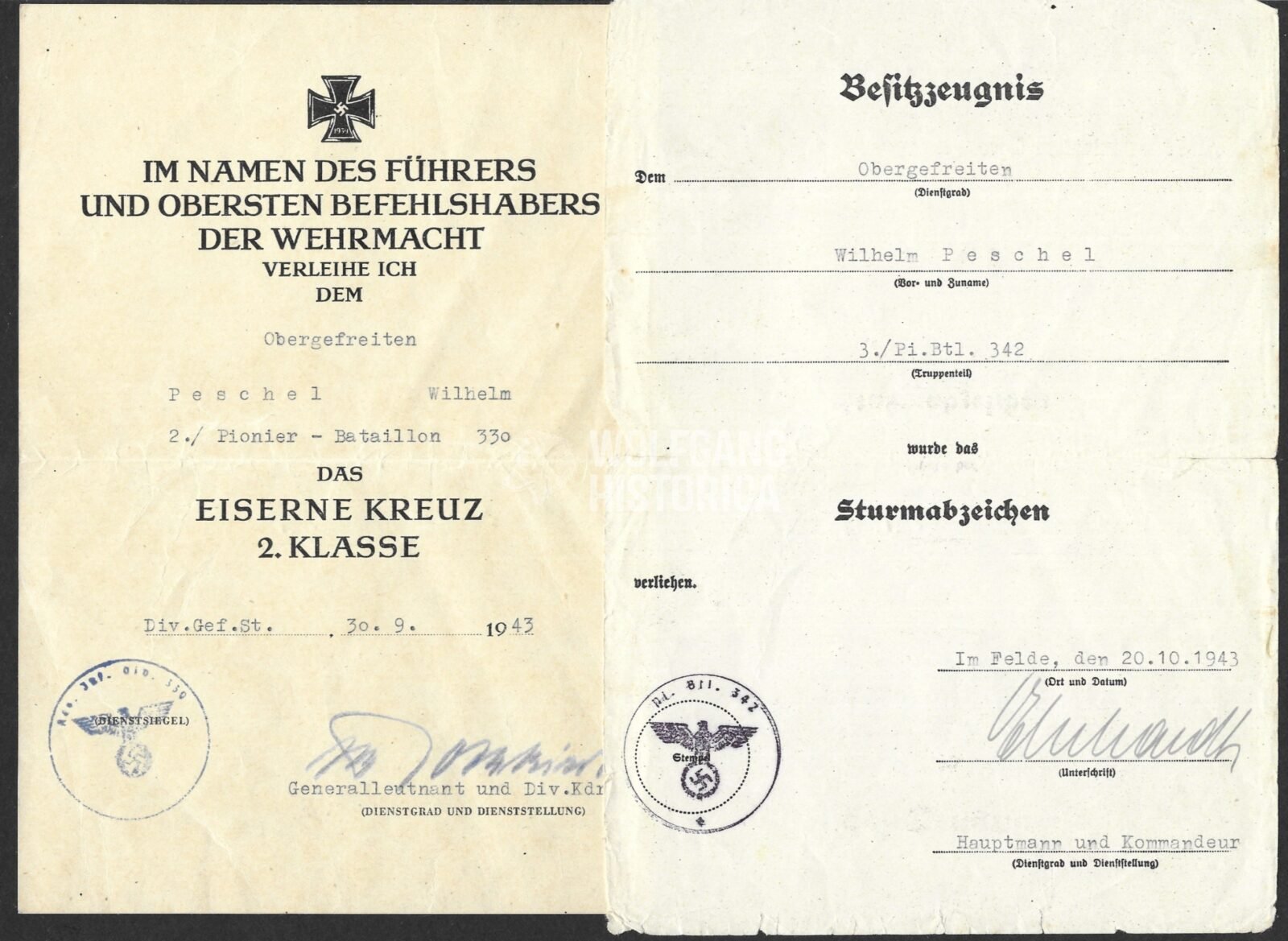 2x Award Docs (EK2, Sturmabzeichen) – Pionier-Bataillon 330 & Pionier-Bataillon 342