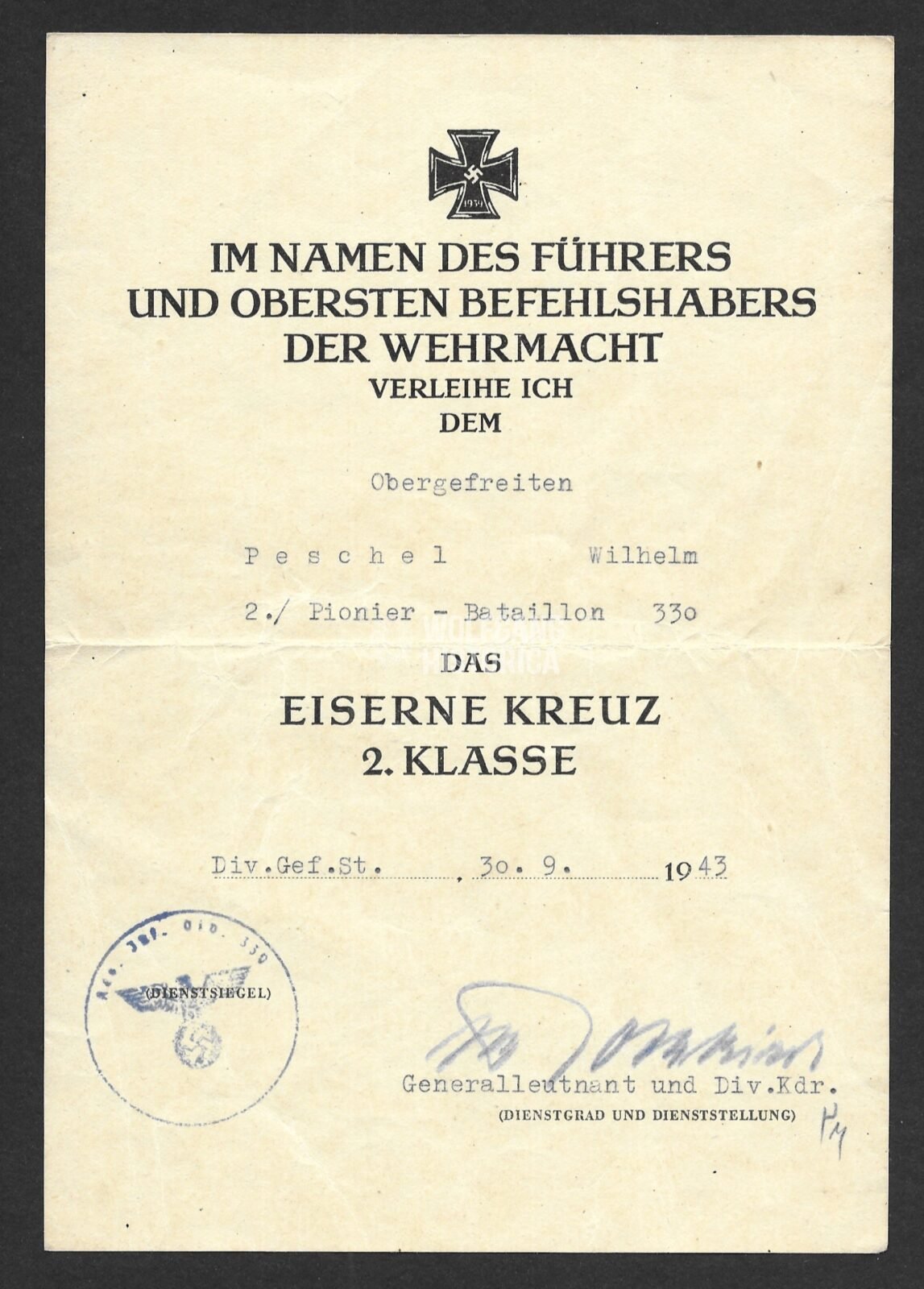 - Award document for the Eisernes Kreuz 2. Klasse (Iron Cross 2nd Class), while serving with 2. Kompanie/ Pionier-Bataillon 330 of the 330. Infanterie-Division. Signed by Edwin Graf von Rothkirch und Trach.
