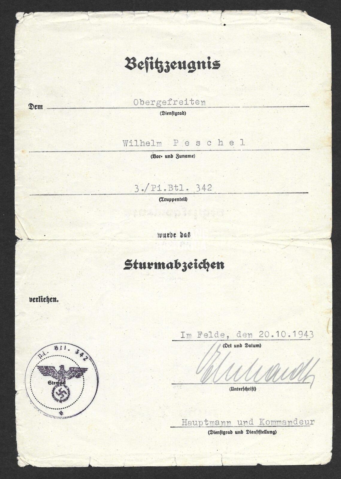 - Award document for the Allgemeines Sturmabzeichen (General Assault Badge), while serving with the 3. Kompanie/ Pionier-Bataillon 342 of the 342. Infanterie-Division. Signed by the Kommandeur.