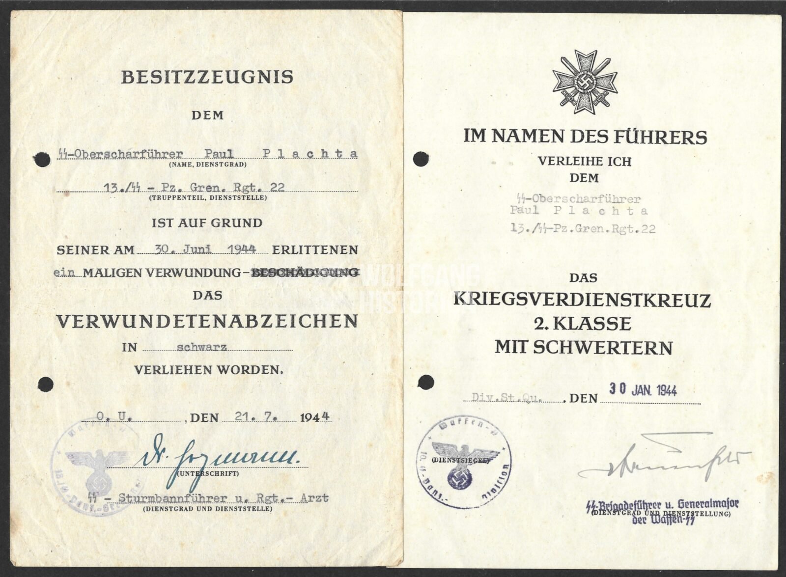 Original award document set of SS-Oberscharführer Paul Plachta who served with the 13. Kompanie/ SS-Panzer-Grenadier-Regiment 22 of the 10. SS-Panzer-Division “Frundsberg” and was wounded during the Battle in Normandy!