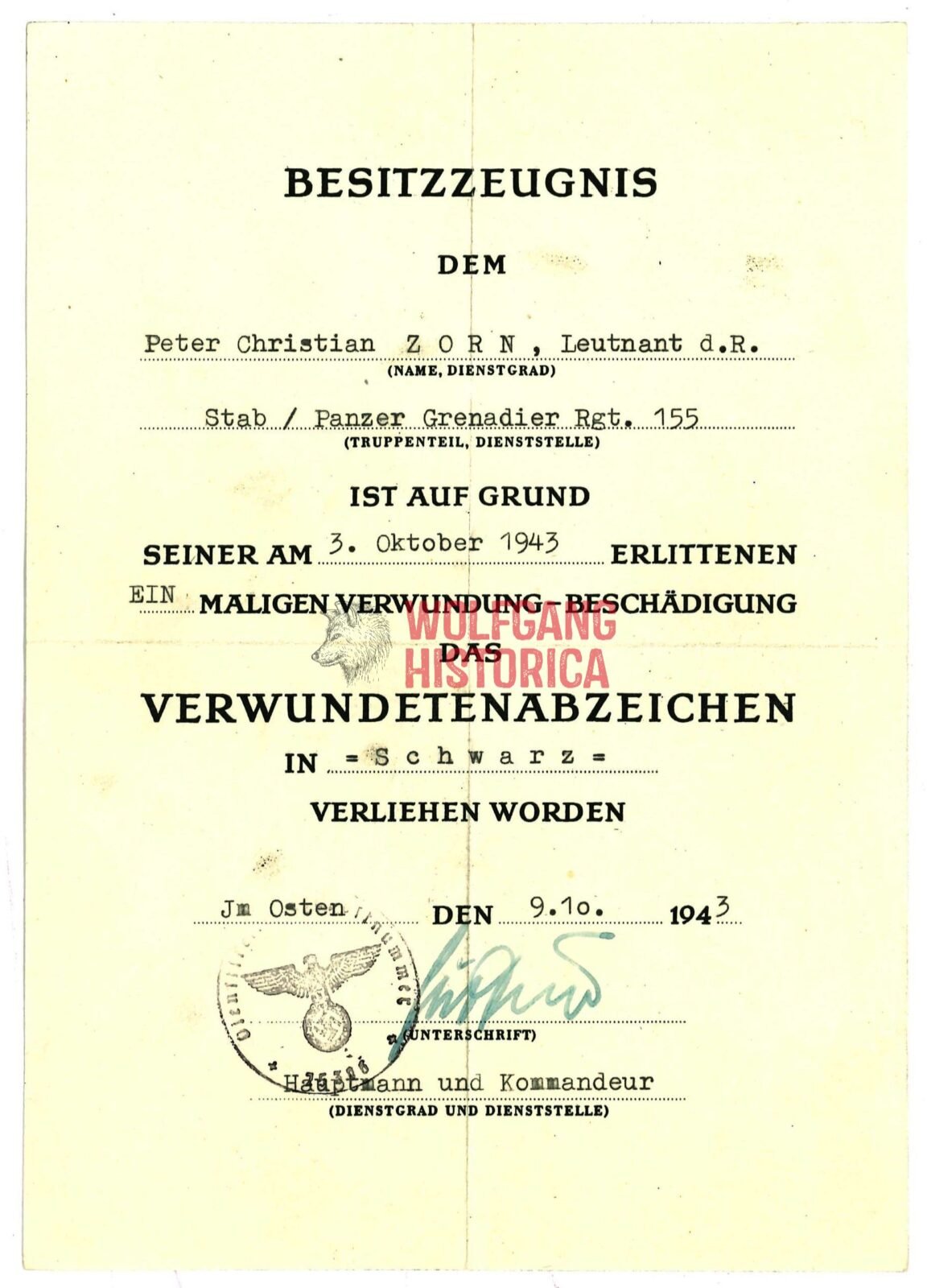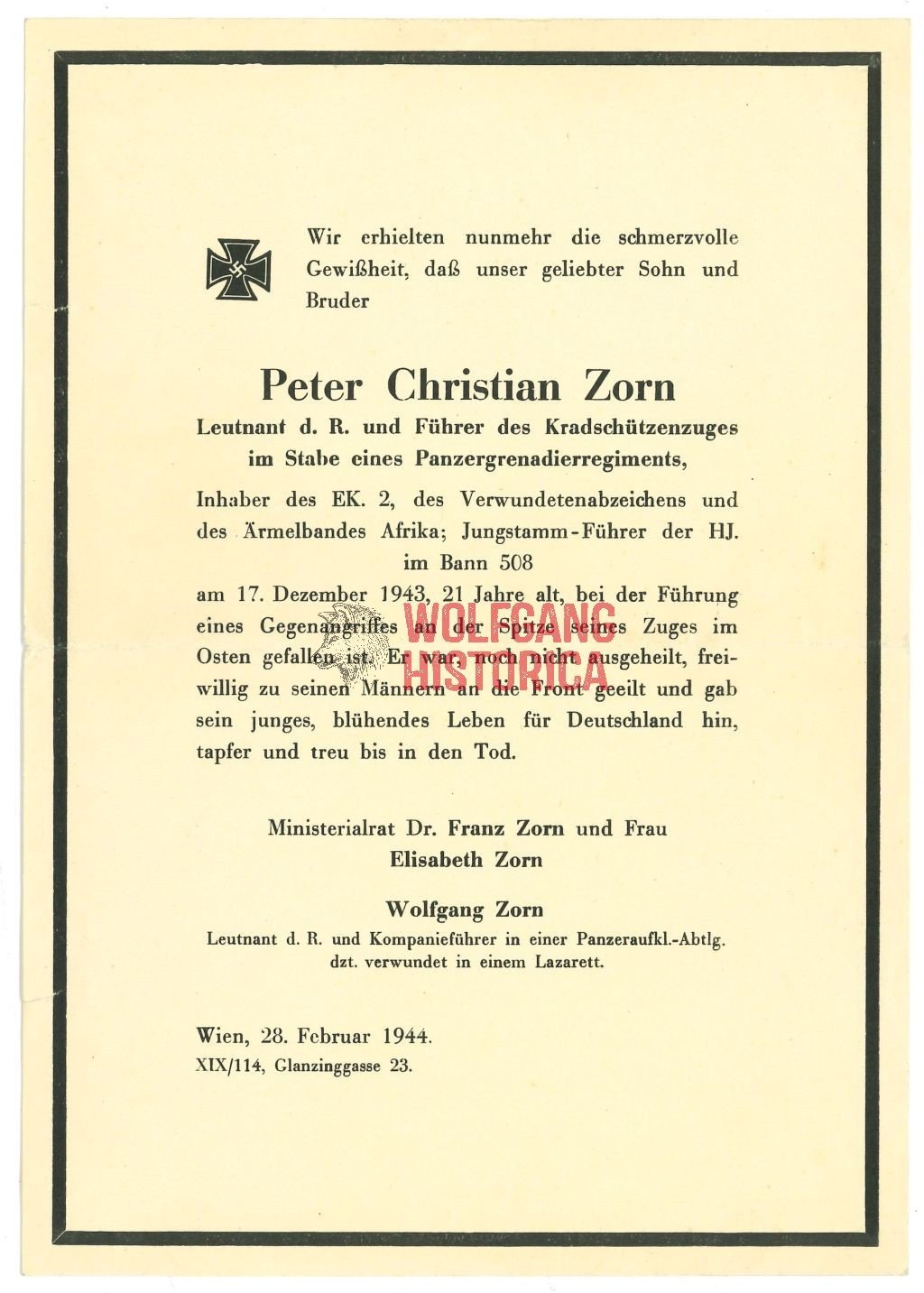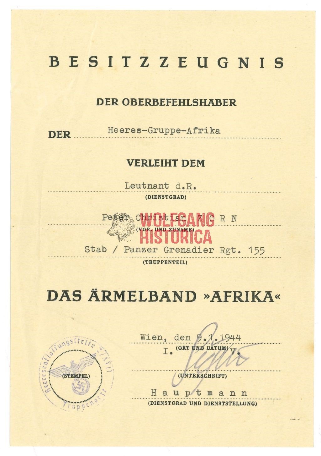 2x Award documents of Leutnant Peter Christian Zorn, who earned the Armelband “Afrika” & Verwundetenabzeichen in Schwarz while with the Panzer-Grenadier-Regiment 155 of the 90. leichten Afrika-Division. He later was Killed in Action on the Eastern Front. Comes with a photo of him and death card. Good condition.