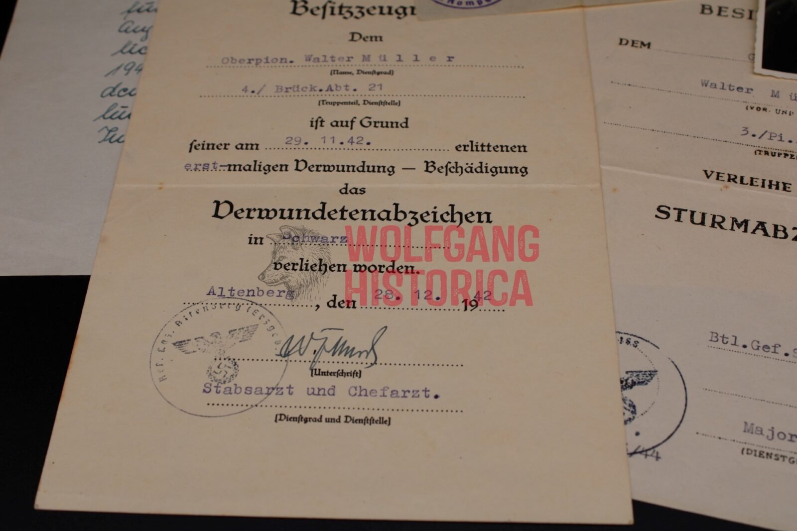 • Award document for the Allgemeines-Sturmabzeichen. Earned on September 15, 1944 with Pionier-Bataillon 188. Signed by an unknown officer.