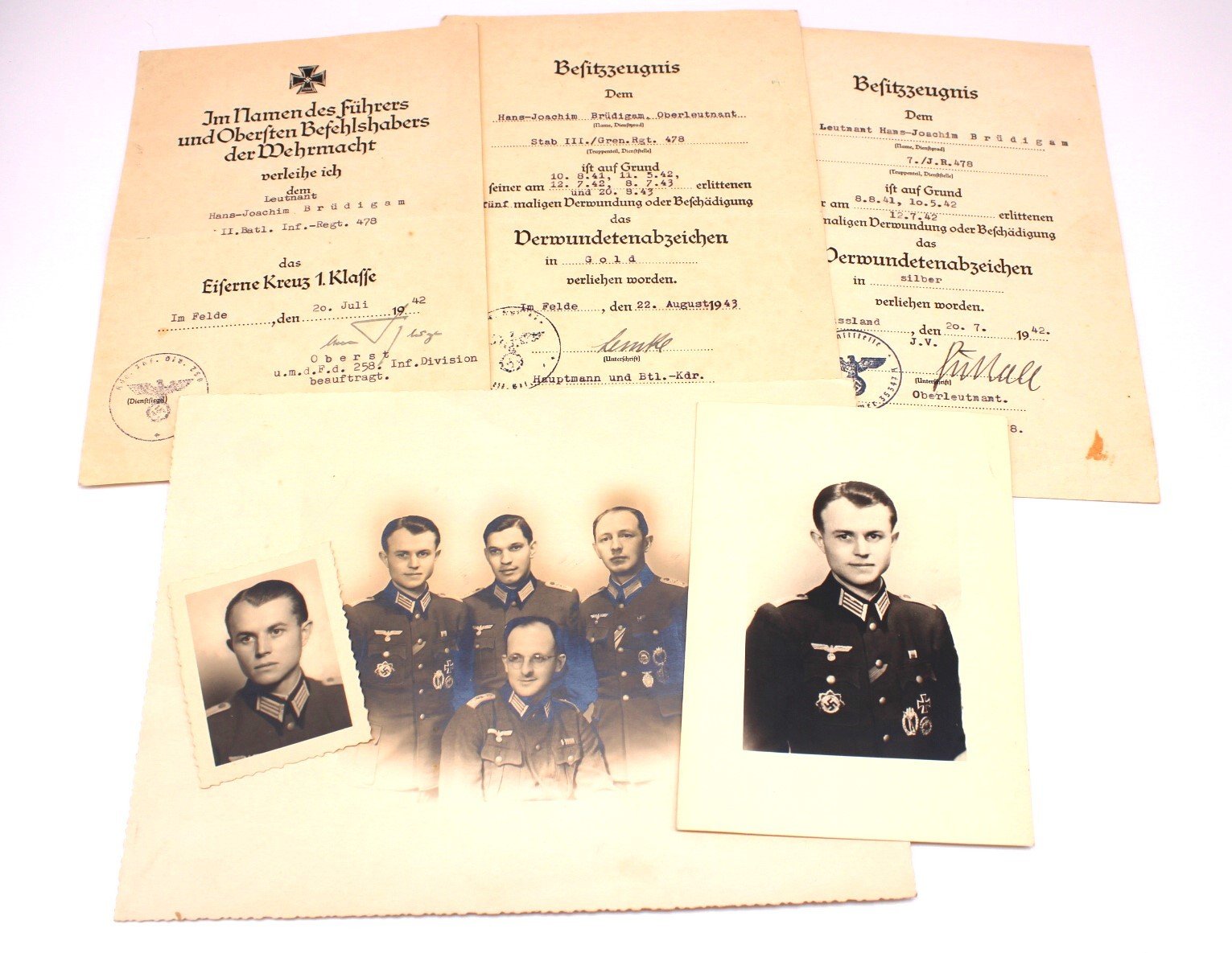 Original Award document & Photograph set of Oberleutnant Hans-Joachim Brüdigam. I’ve researched him as good as I could within WASt. He was Killed in Action on July 28, 1944 in “St. Angele-Meynac”, France. You’ll receive more wound data etc. after purchase.