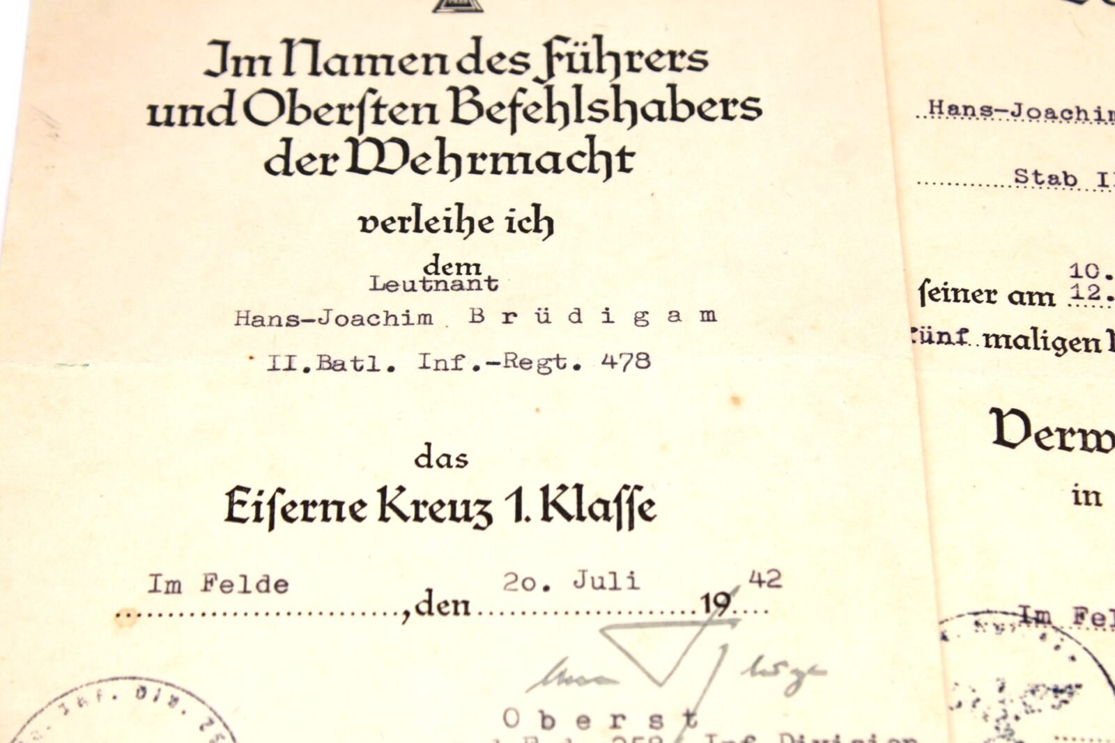 - Award document for the Eisernes Kreuz 1. Klasse, awarded on July 20, 1942 while serving with Stab II./ Infanterie-Regiment 478 of the 258. Infanterie-Division. Signed by Oberst Wolfgang von Kluge (RK, his brother was linked to the “July 20 Plot”!).
