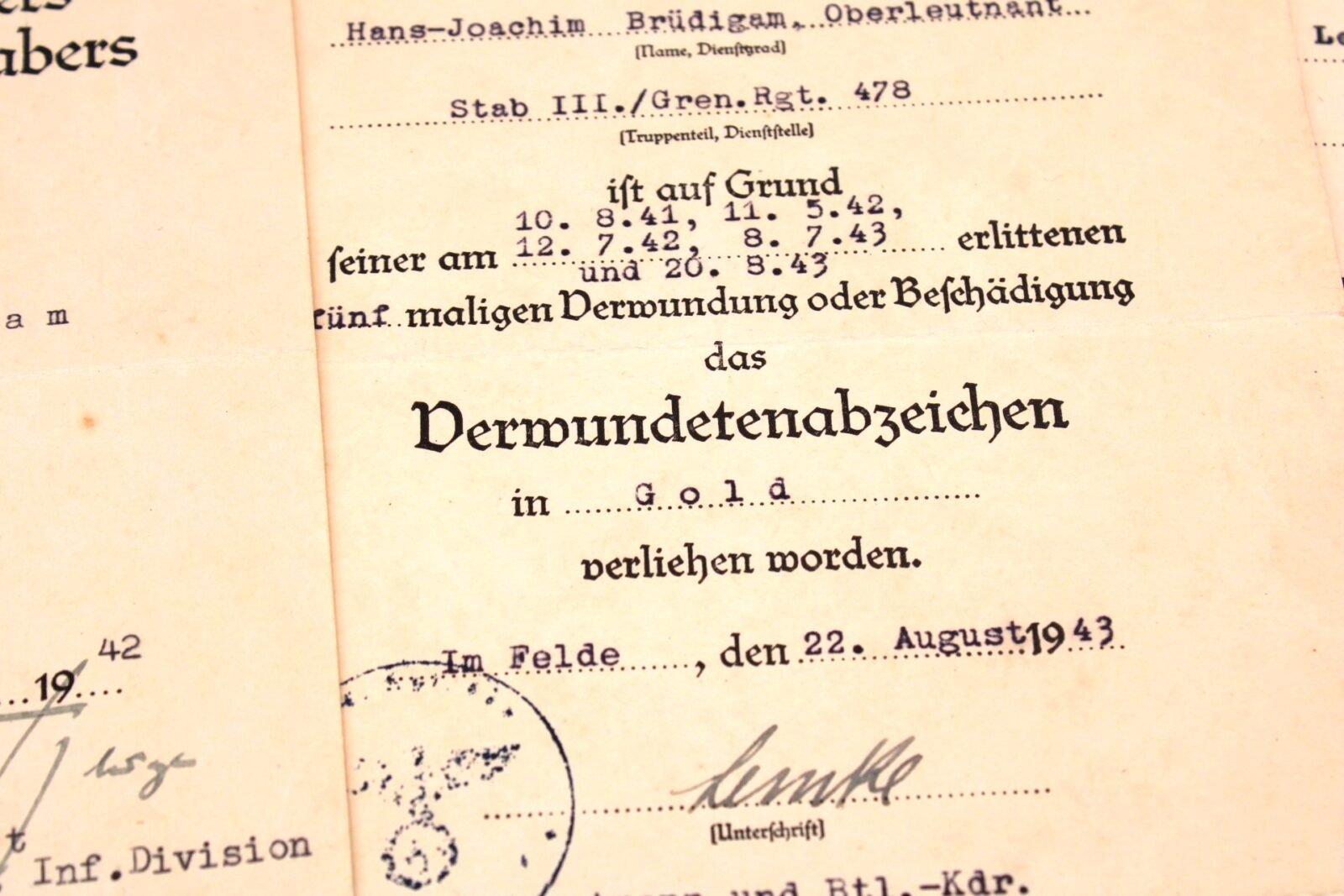 - Award document for the Verwundetenabzeichen in Gold, awarded on August 22, 1943. Signed by Hauptmann Konrad Lemke (DKIG-EBS).