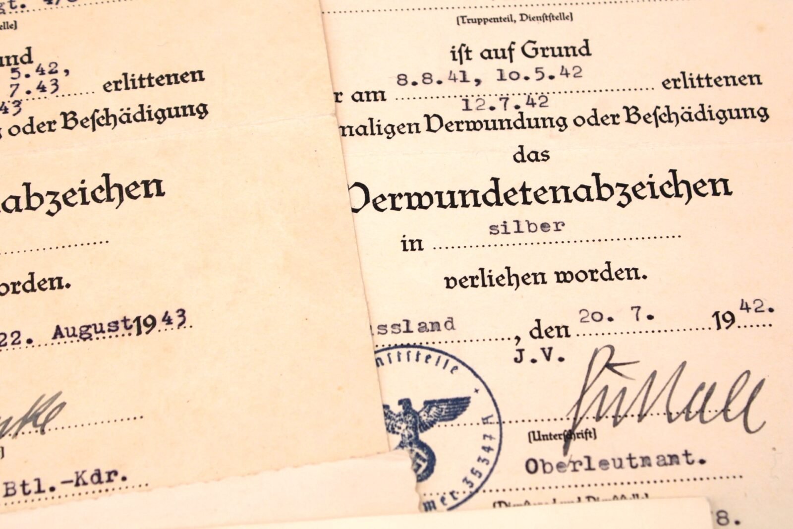 - Award document for the Verwundetenabzeichen in Silber, awarded on July 20, 1942. Signed by an unknown officer.