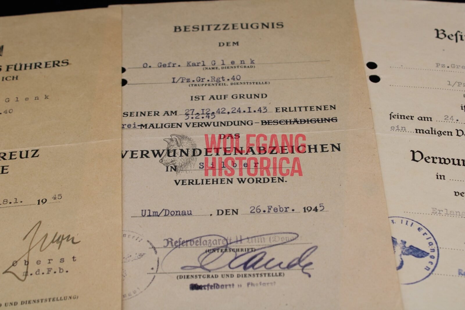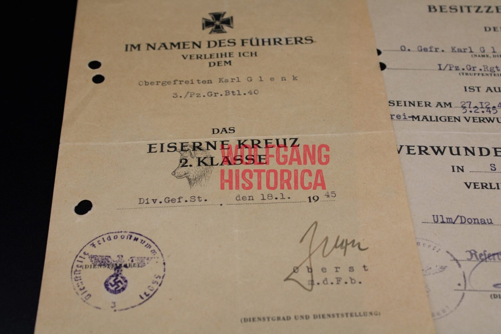 3x Award document set (two earned in 1945!) for the Verwundetenabzeichen in Schwarz, Verwundetenabzeichen in Silber (1945) and Eisernes Kreuz 2. Klasse (1945) while serving the Panzer-Grenadier-Regiment 40. The Eisernes Kreuz 2. Klasse award document was signed by Oberst Eduard Zorn (posthumously promoted to Generalmajor), who was the temporary commander of the 189. Infanterie-Division. Zorn earned the Ritterkreuz mit Eichenlaub and was Killed in Action on February 4, 1945 in the Colmar Pocket! Documents were punched. Good condition.