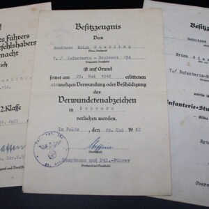 - Verwundetenabzeichen in Schwarz (Wound Badge in Black) for his wound suffered on May 29, 1942. Signed by an unknown officer.