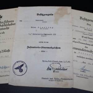 - Infanterie-Sturmabzeichen in Silber (Infantry Assault Badge in Silver) on July 1, 1942, for 3 separate infantry assault days during his service! Signed by Alexander von Pfuhlstein (RK, 20 July Plot!)