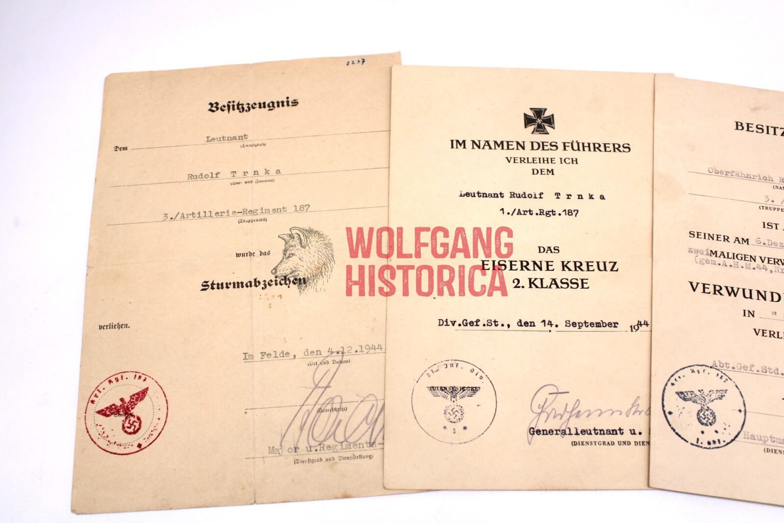 3x Original Award documents for Leutnant Rudolf Trnka who served with the Artillerie-Regiment 187 of the 87. Infanterie-Division. During his service, he earned the Eisernes Kreuz 2. Klasse (Iron Cross 2nd Class) for his service on September 14, 1944, the Allgemeines Sturmabzeichen (Assault Badge) on December 4, 1944 and the Verwundetenabzeichen in Silber (Wound Badge in Silver) on June 10, 1944. 1x Document was signed by Generalleutnant Gerhard Feyerabend (RK). The Assault badge could be signed by Major Friedbert Bäcker (DKIG). Condition of the documents as seen!