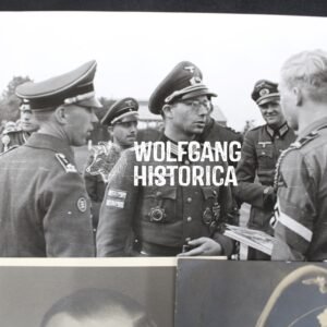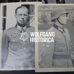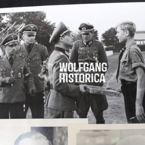 The grouping includes studio portraits and field photographs, all depicting the same officer, both in uniform close-ups and during an outdoor award ceremony with Hitlerjugend members. Several of the images show him in discussion with senior officers and HJ leaders, presenting awards and documents — a rarely documented interaction between Wehrmacht and Hitler Youth units in the final war years.