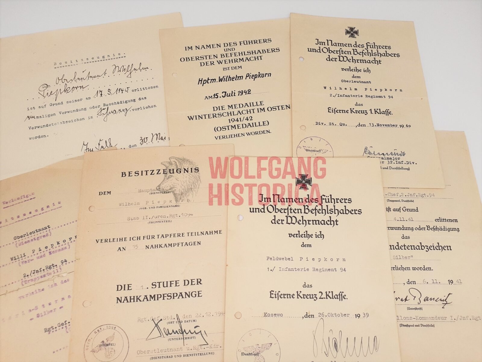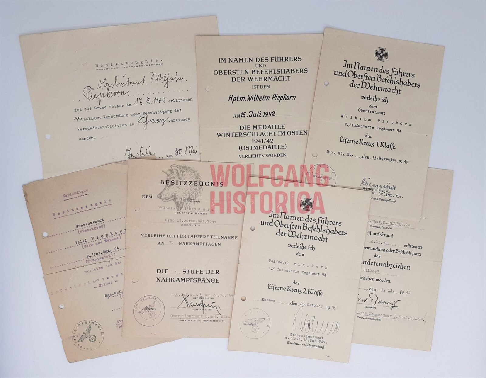 Interesting 7x (!) Award document set for Hauptmann Wilhelm Piepkorn, who earned the Deutsches Kreuz in Gold on June 23, 1942 with 2. Kompanie/ Infanterie-Regiment 94 of the 32. Infanterie-Division. Later served with the Stab II./ Grenadier-Regiment 1094 of the 548. Volksgrenadier-Division!