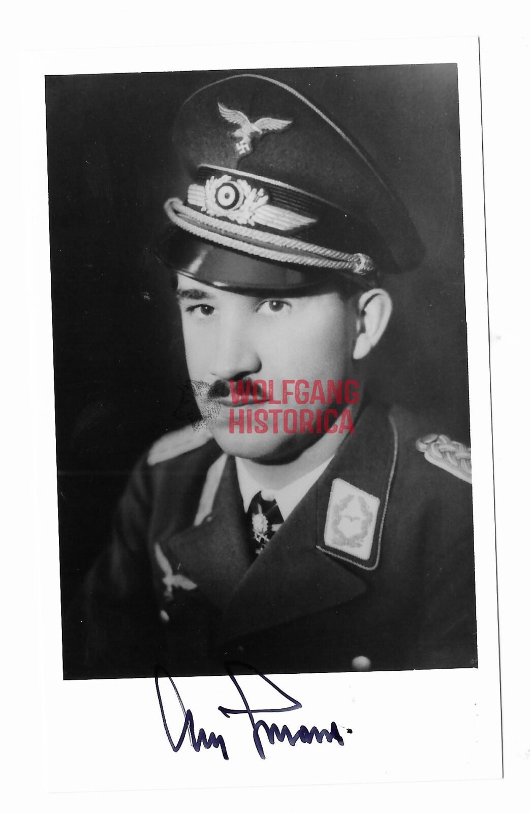 Original Postwar Signature on a Postwar Photo of Adolf Galland. Generalleutnant Adolf Galland (19.03.1912 † 09.02.1996) earned the Ritterkreuz on July 29, 1940 as Major und Kommandeur of the III. Gruppe/ Jagdgeschwader 26 “Schlageter”, the Eichenlaub on September 24, 1940 as Major und Kommodore of Jagdgeschwader 26 “Schlageter”, the Schwertern on June 21, 1941 as Oberstleutnant und Kommodore of Jagdgeschwader 26 “Schlageter” and the Brillanten on January 28, 1942 as Oberst und Kommodore of Jagdgeschwader 26 “Schlageter”. Good condition. Measuring: PC-size.