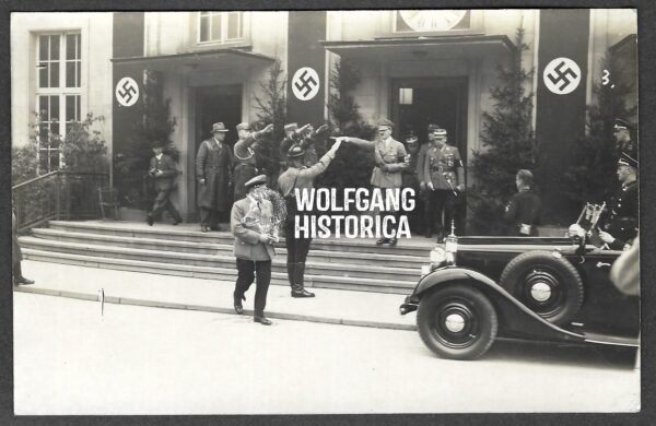 Such official receptions were a hallmark of the Nazi leadership’s public appearances, often documented by the Heinrich Hoffmann press agency for propaganda and state archives. Hitler’s personal car, identifiable by its distinct design and SS escort, was frequently photographed during these ceremonial arrivals and departures.