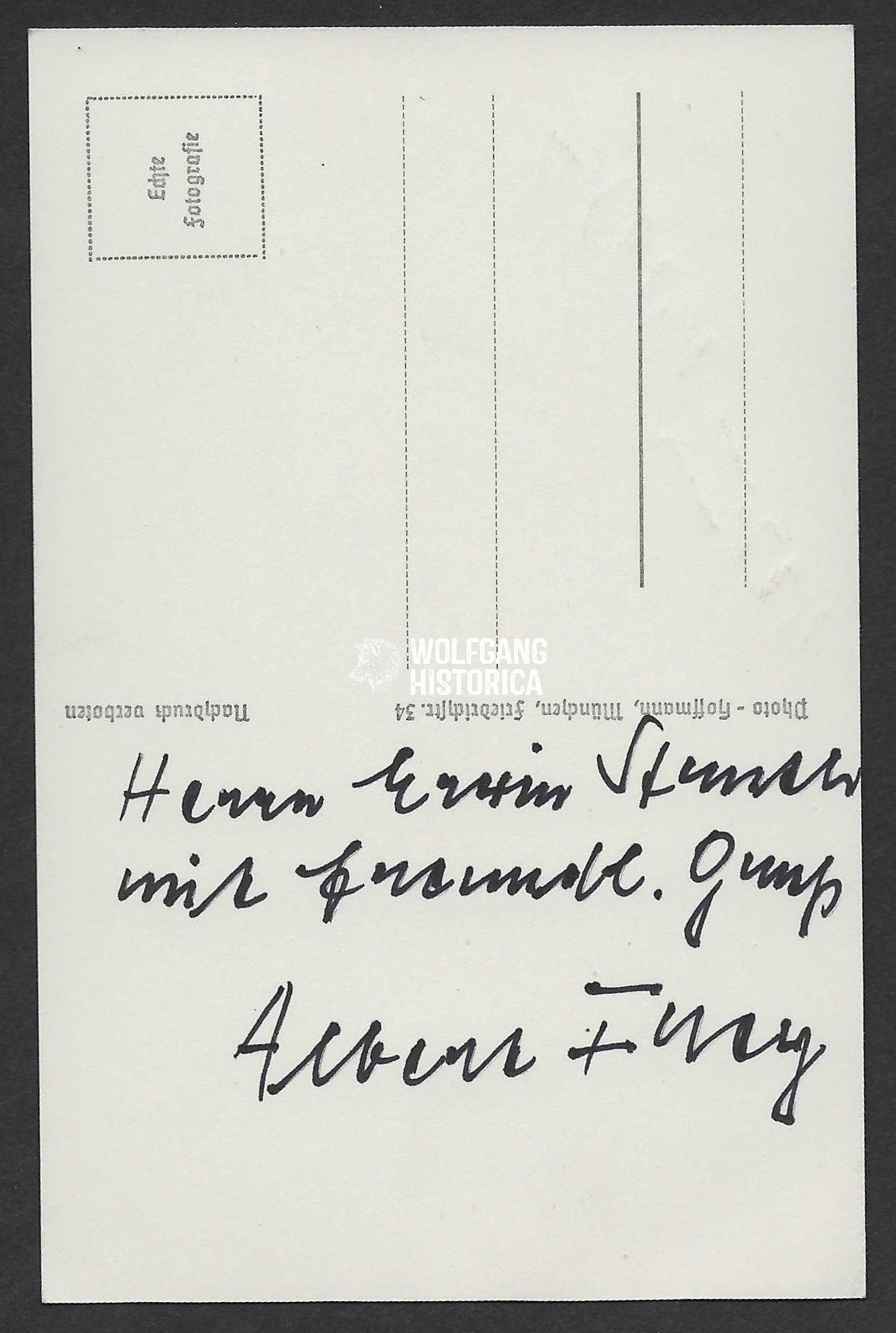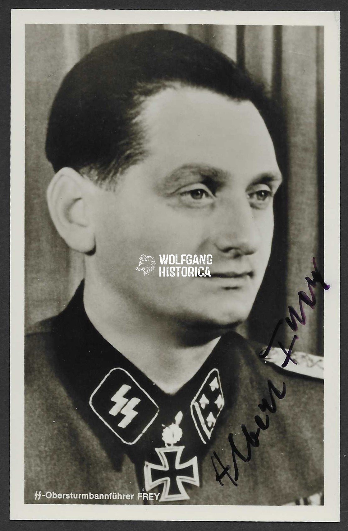 Original Postwar Signature on a Postwar Photo of Albert Frey. SS-Standartenführer Albert Frey (16.02.1913 † 01.09.2003) earned the Deutsches Kreuz in Gold on November 17, 1941 with SS-Infanterie-Regiment “Leibstandarte-SS Adolf Hitler”, the Ritterkreuz on March 3, 1943 as SS-Sturmbannführer und Kommandeur of the I. Bataillon/ SS-Panzer-Grenadier-Regiment 1 “LSSAH” and the Eichenlaub on December 29, 1943 as SS-Obersturmbannführer und Kommandeur of the SS-Panzer-Grenadier-Regiment 1 of the 1. SS-Panzer-Division “LSSAH“. Signed on the front and reverse! Postcardsize.