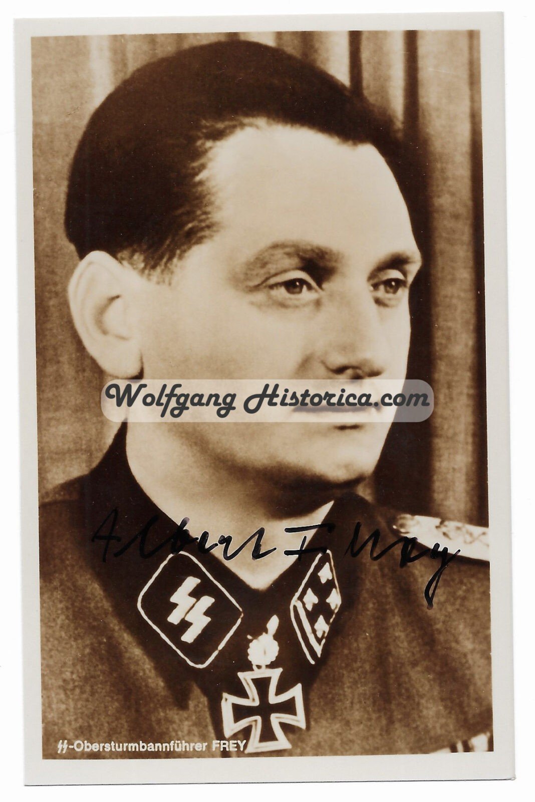 Original Postwar Signature on a Postwar Photo of Albert Frey. SS-Standartenführer Albert Frey (16.02.1913 † 01.09.2003) earned the Deutsches Kreuz in Gold on November 17, 1941 with SS-Infanterie-Regiment “Leibstandarte-SS Adolf Hitler”, the Ritterkreuz on March 3, 1943 as SS-Sturmbannführer und Kommandeur of the I. Bataillon/ SS-Panzer-Grenadier-Regiment 1 “LSSAH” and the Eichenlaub on December 29, 1943 as SS-Obersturmbannführer und Kommandeur of the SS-Panzer-Grenadier-Regiment 1 of the 1. SS-Panzer-Division “LSSAH“. Good condition. Measuring: Postcardsize.