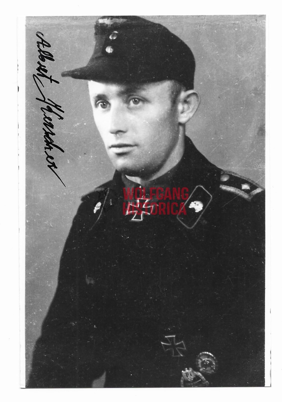 Original Postwar Signature of Albert Kerscher. Feldwebel Albert Kerscher (29.03.1916 † 12.06.2011) earned the Ritterkreuz on October 23, 1944 as Feldwebel in the 2. Kompanie/ schwere Panzer-Abteilung 502 (Tigers). He also earned the Panzerkampfabzeichen IV. Stufe (Einsatzahl “75”). Good Condition. Postcardsize.