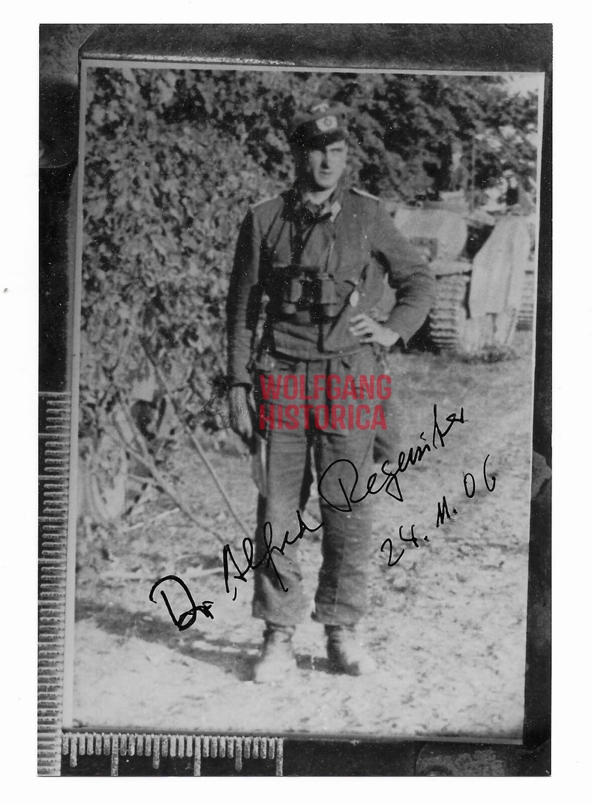 Original Postwar Signature on a Postwar Photo of Alfred Regeniter. Leutnant Alfred Regeniter (13.01.1922 † 20.07.2016) earned the Ritterkreuz on April 5, 1945 as Leutnant und Führer of the 3. Batterie/ Sturmgeschütz-Brigade 276. Good condition. Postcardsize.