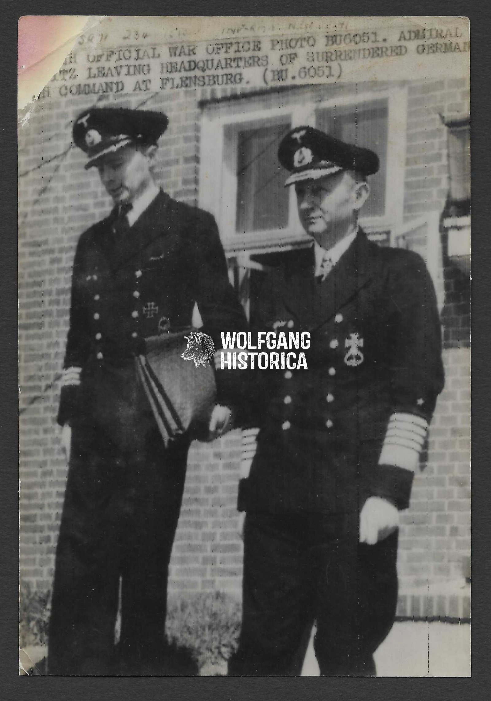 Original Allied Press Photo of the surrender of Großadmiral Karl Dönitz at Flensburg, 1945. 18×13 cm. Condition as seen.