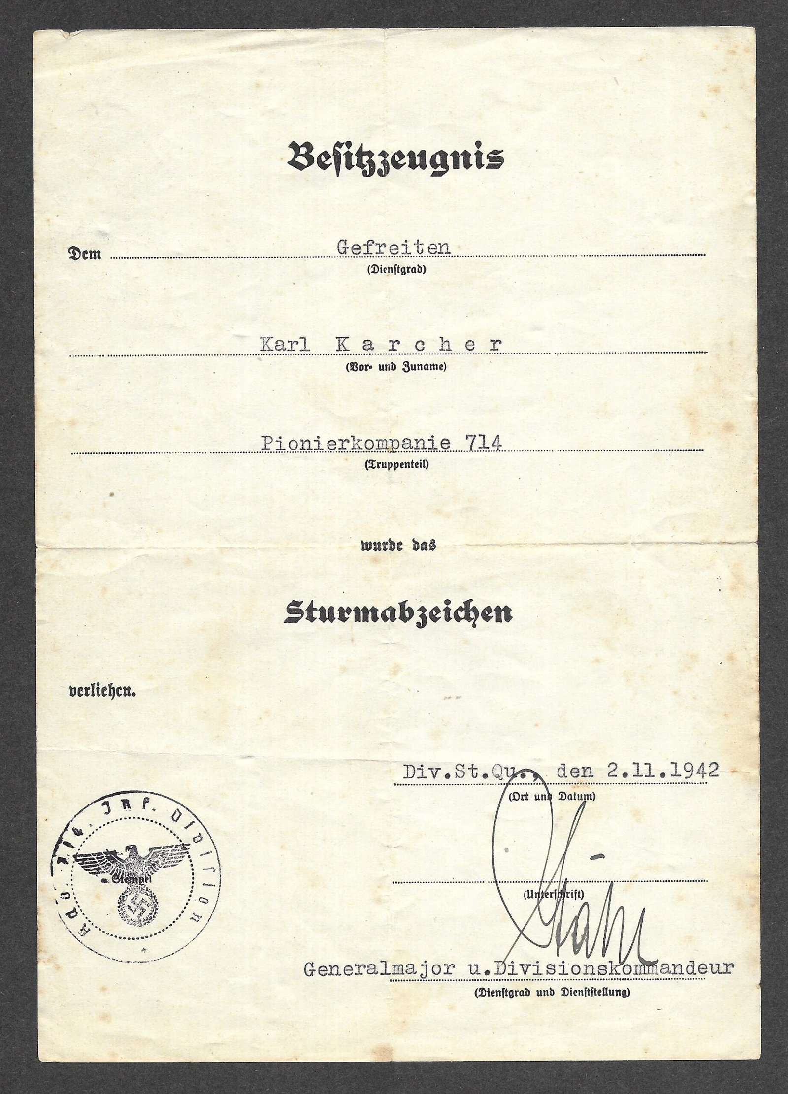 An authentic wartime award document issued to Gefreiter Karcher, who served with Pionierkompanie 714 of the 714. Infanterie-Division (later re-designated as the 114. Jäger-Division).