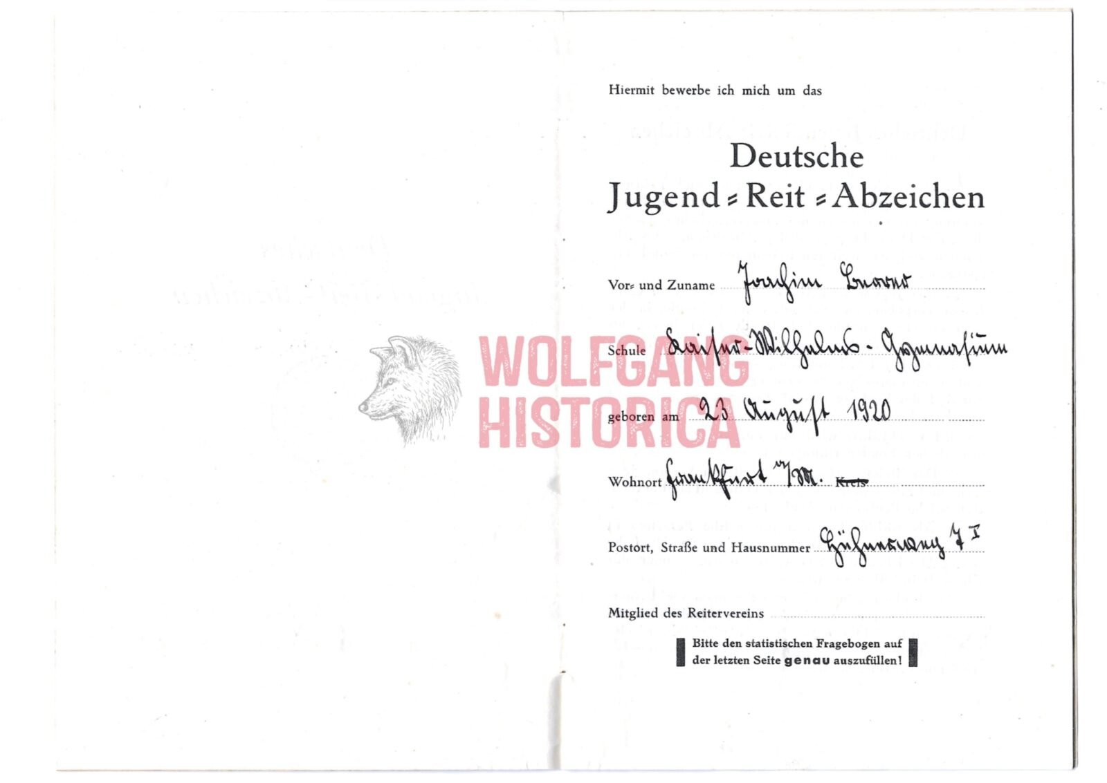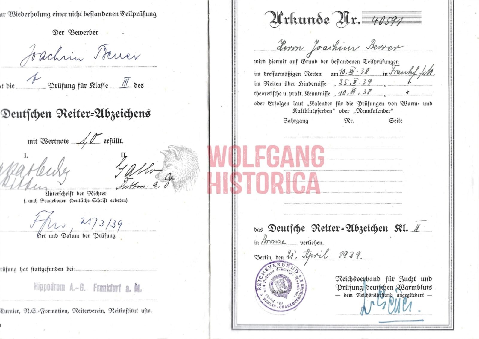2x Award documents of Joachim Beuer for the Deutsches-Jugend-Reit-Abzeichen and the Deutsche Reiter-Abzeichen. Good condition. (Note: My scanner has problems scanning a few shades of whites due that they look brighter).