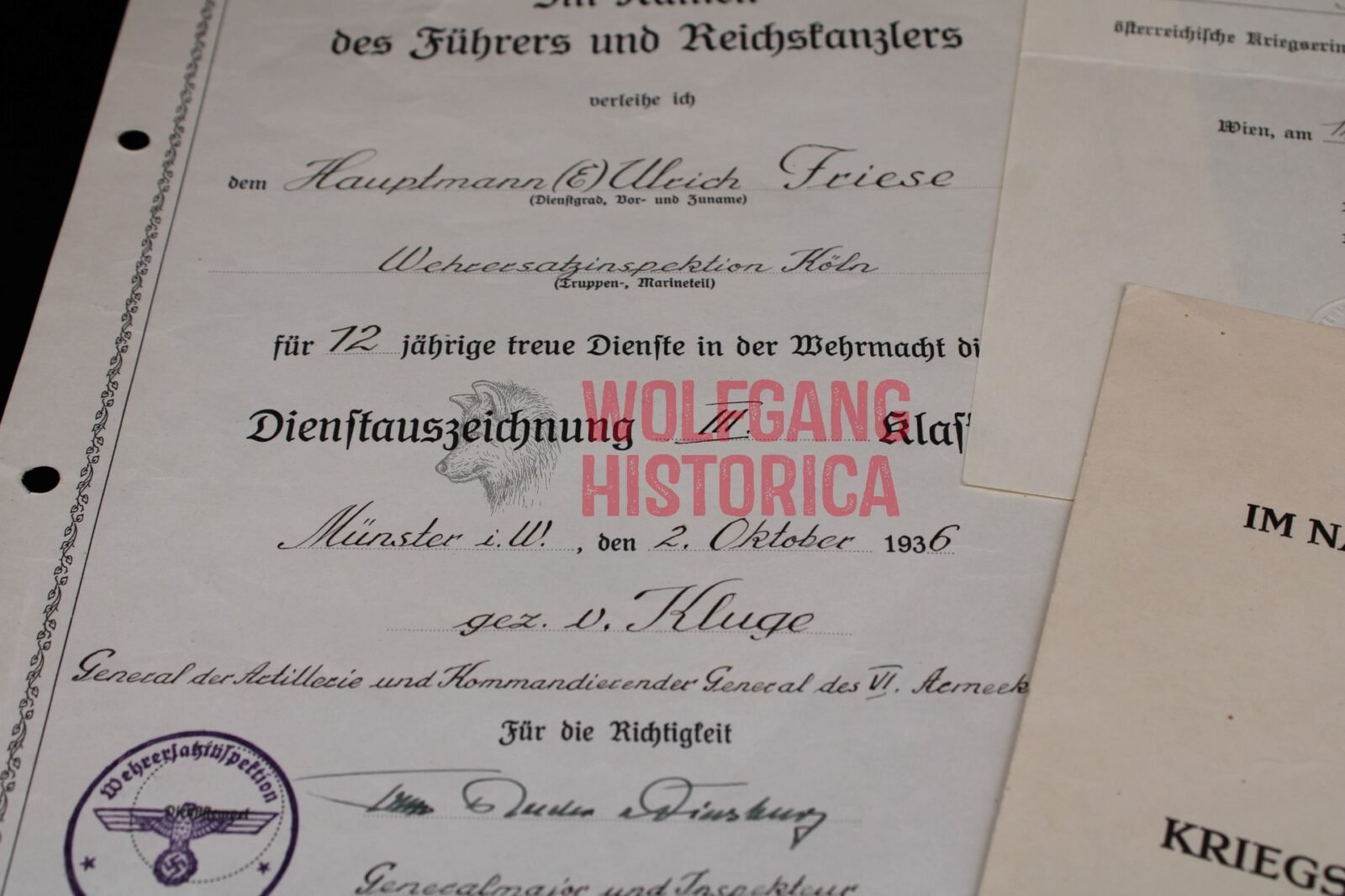 Award document for the Kriegsverdienstkreuz 1. Klasse mit Schwertern (War Merit Cross 1nd Class with Swords) of Oberst Ulrich Friese, who earned it for his service on September 1, 1944 while serving with Wehrkreis VI in Münster! Beautiful Münster variant of General der Infanterie Franz Mattenklott. Also an award document for the Wehrmacht-Dienstauszeichnung III. Klasse (12 jahre) (Service for 12 Years in the Wehrmacht), earned in 1936. Document was signed by Generalmajor Kurt Freiherr Röder von Diersburg.