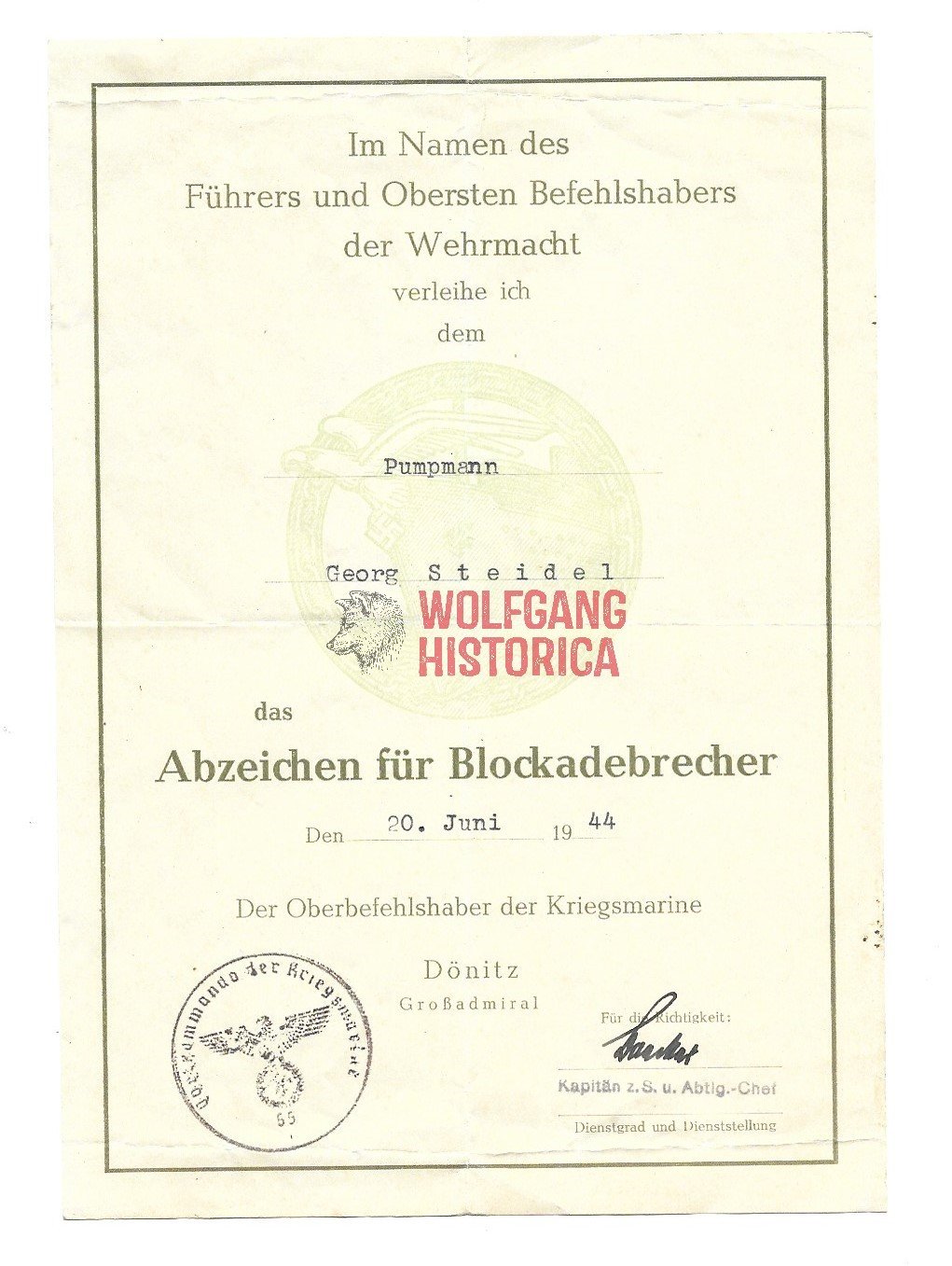 Original Award document of Pumpann Georg Steidel for the Abzeichen für Blockadebrecher which was awarded on June 20, 1944. Signed by an unknown officer. Condition as seen.