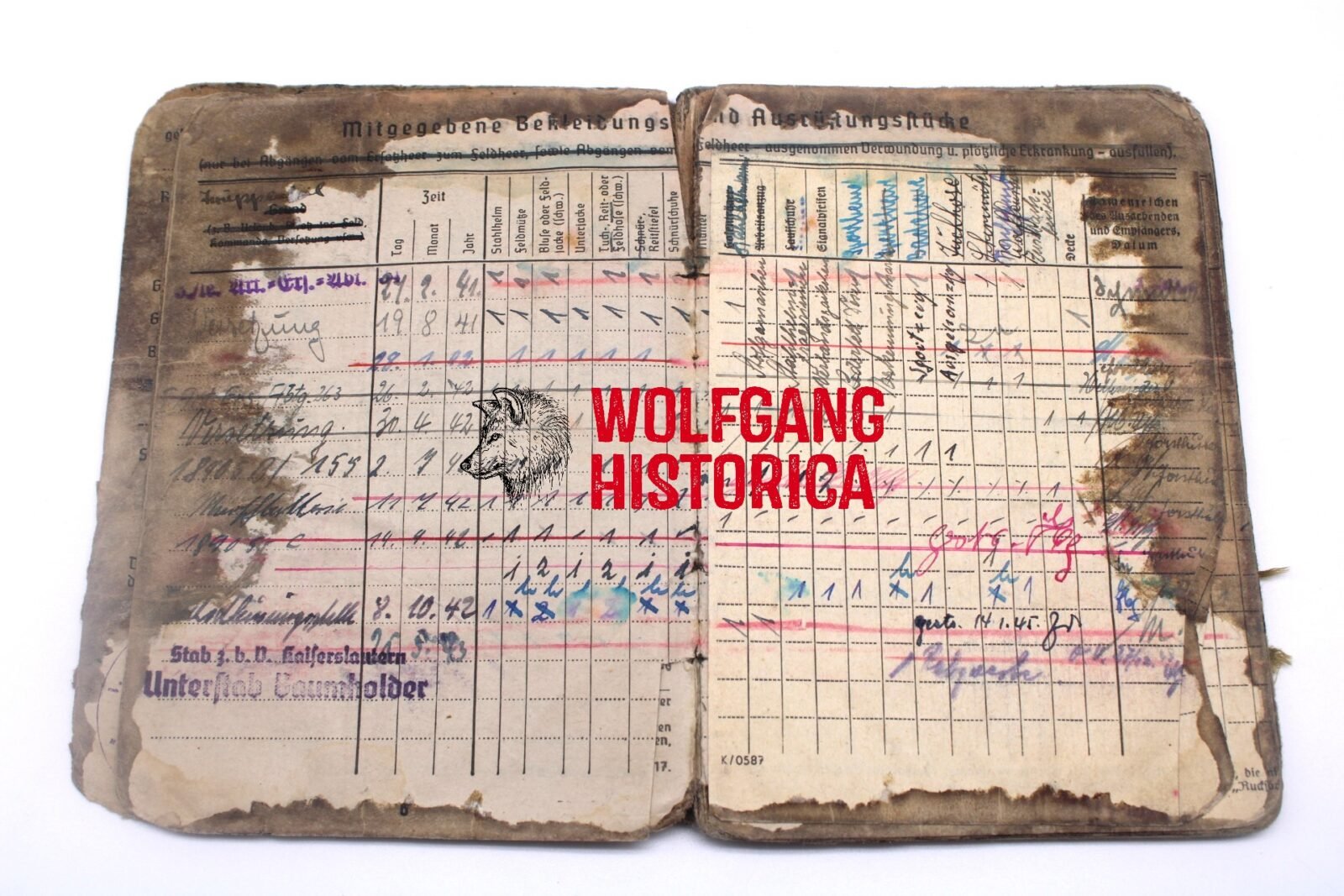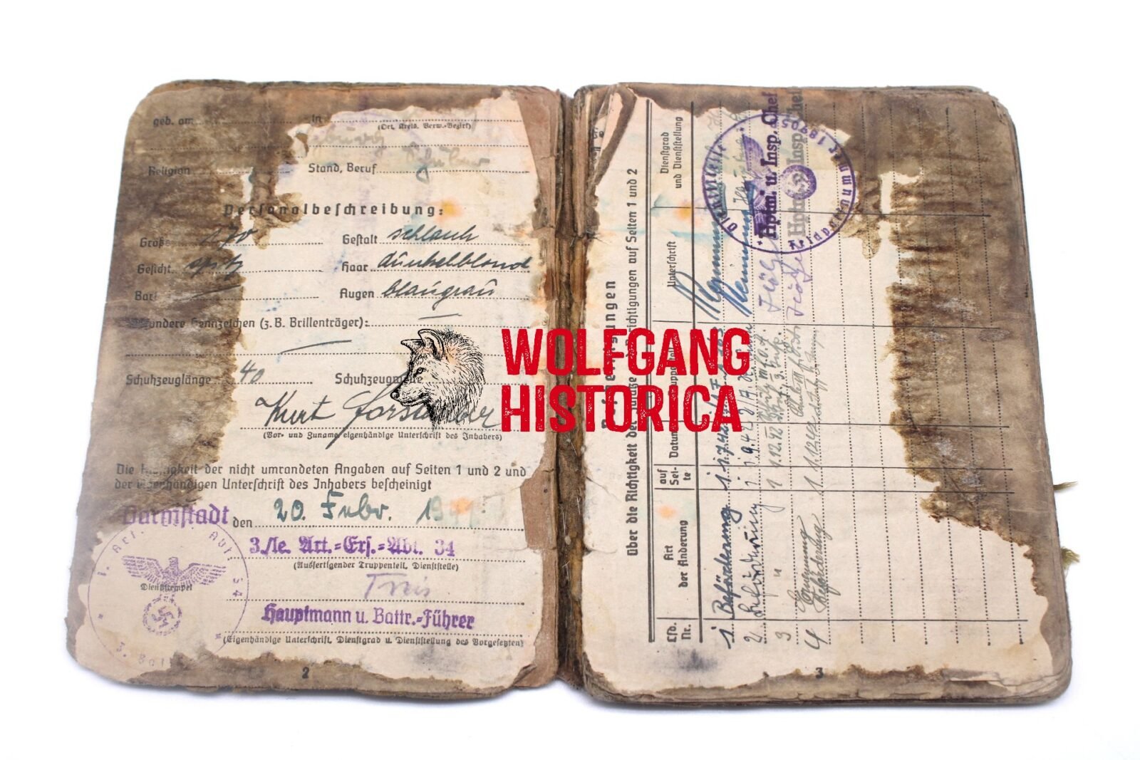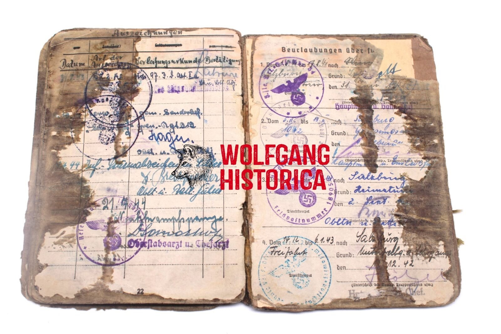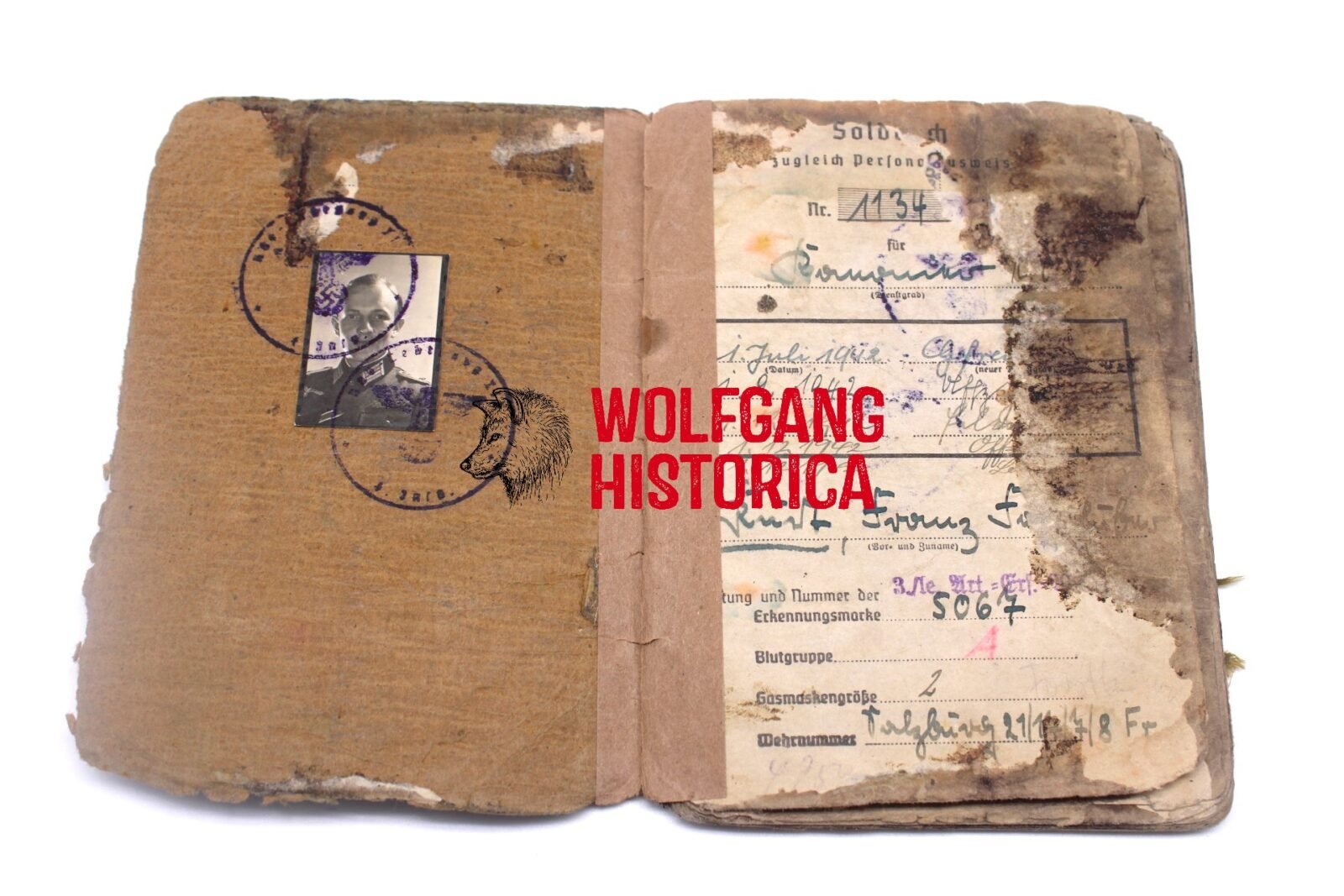 Original Blood-Soaked Soldbuch of Leutnant Kurt Franz Forsthuber, born on August 30, 1921 in xxxx. The Soldbuch was opened on October 15, 1943. He wore the Erkennungsmarke: -5067- 3.le.Art.Ers.Abt.