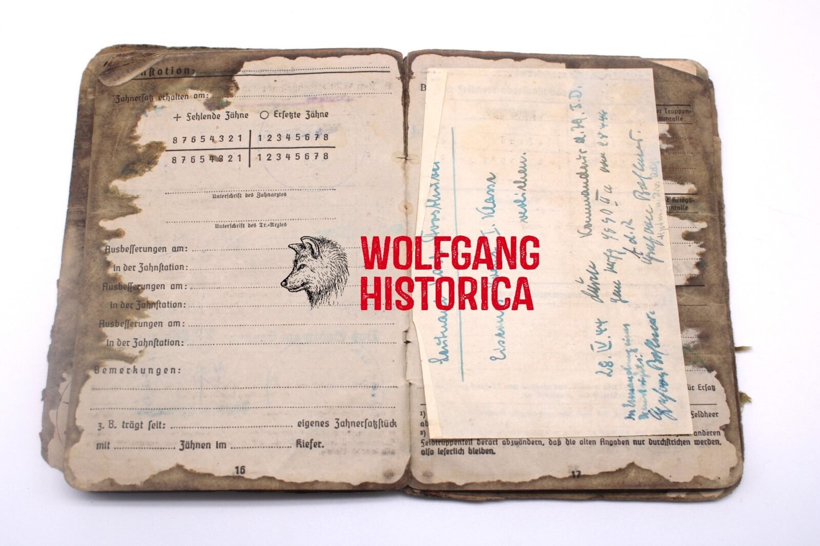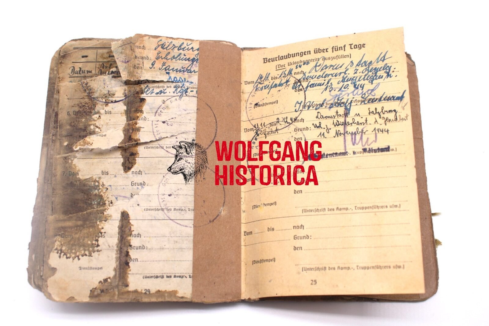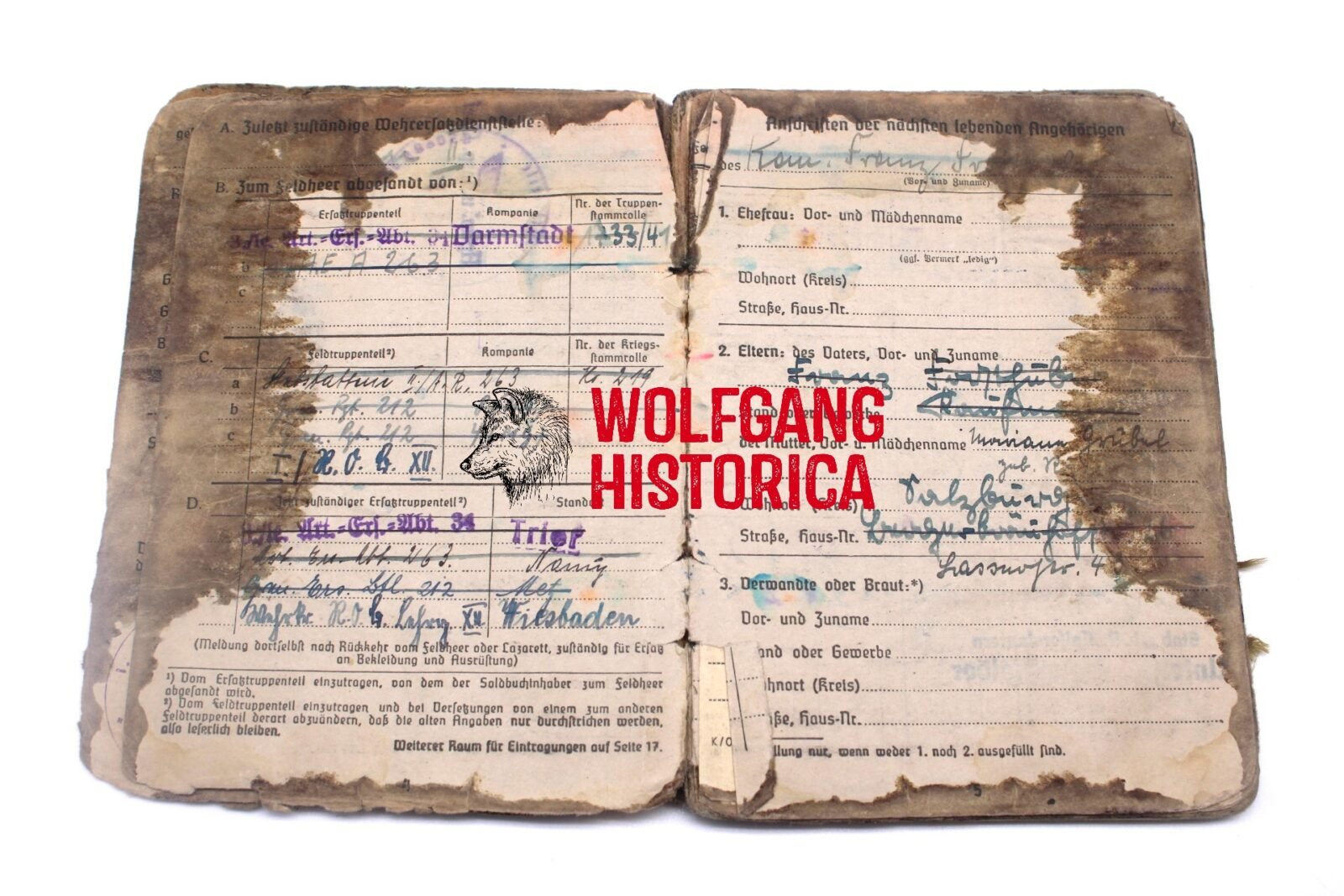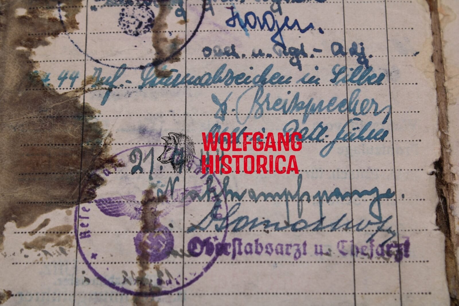 Original Blood-Soaked Soldbuch of Leutnant Kurt Franz Forsthuber, born on August 30, 1921 in xxxx. The Soldbuch was opened on October 15, 1943. He wore the Erkennungsmarke: -5067- 3.le.Art.Ers.Abt.