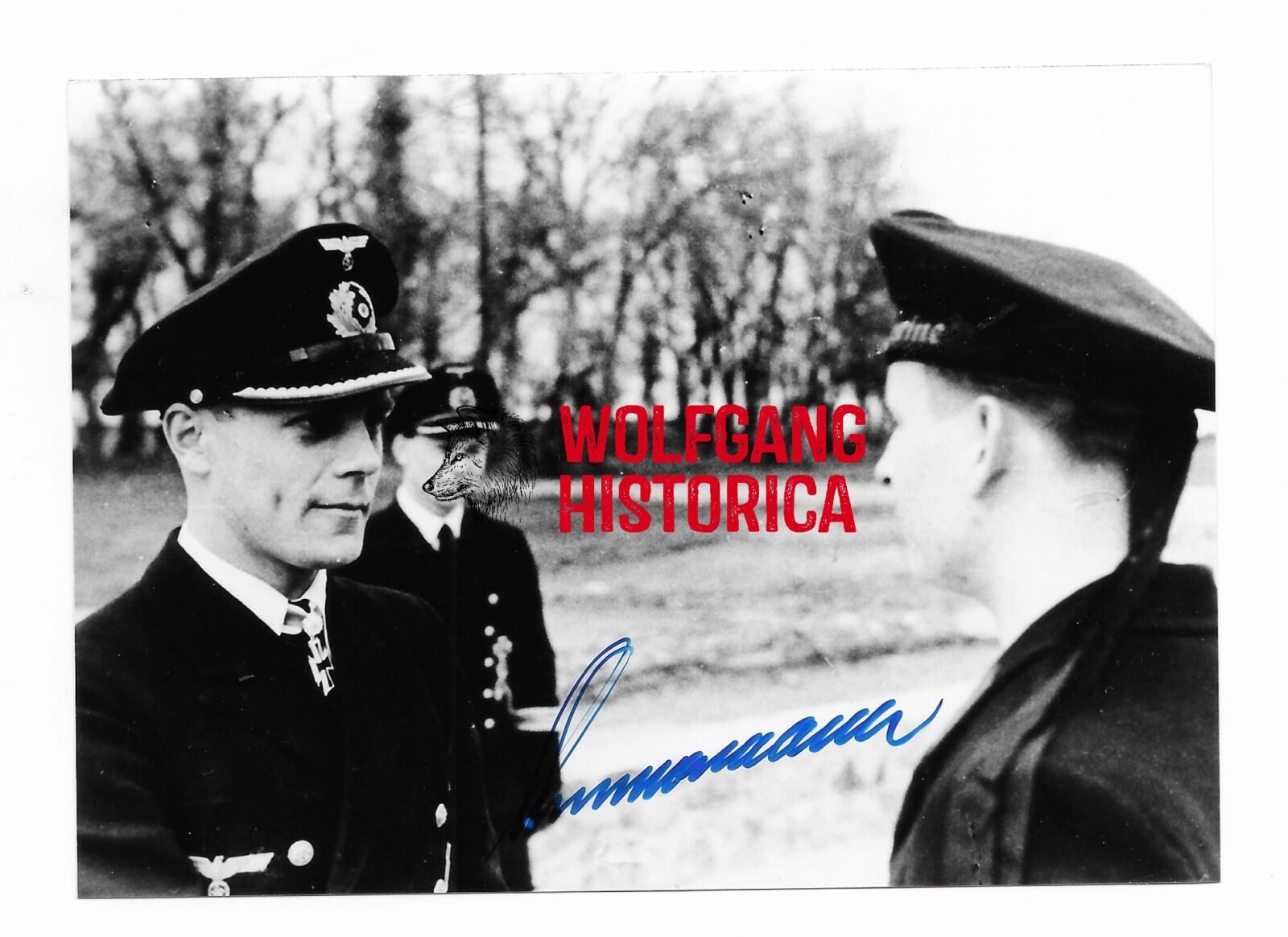 Original Postwar Signature on a Postwar Photo of Carl Emmermann. Kapitänleutnant Carl Emmermann (06.03.1915 † 25.03.1990) earned the Ritterkreuz des Eisernen Kreuzes on November 27, 1942 as Kapitänleutnant und Kommandant of U-172 and the Eichenlaub on July 4, 1943 as Kapitänleutnant und Kommandant of U-172.