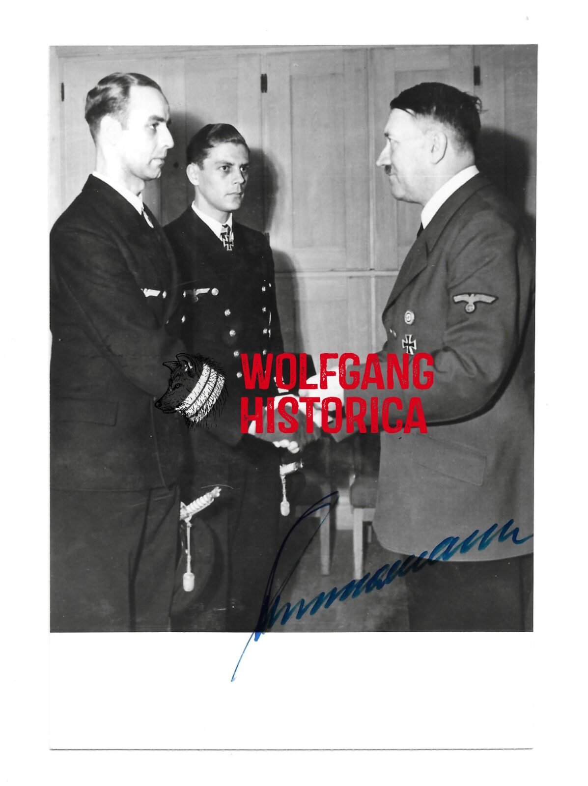 Original Postwar Signature on a Postwar Photo of Carl Emmermann. Kapitänleutnant Carl Emmermann (06.03.1915 † 25.03.1990) earned the Ritterkreuz des Eisernen Kreuzes on November 27, 1942 as Kapitänleutnant und Kommandant of U-172 and the Eichenlaub on July 4, 1943 as Kapitänleutnant und Kommandant of U-172.