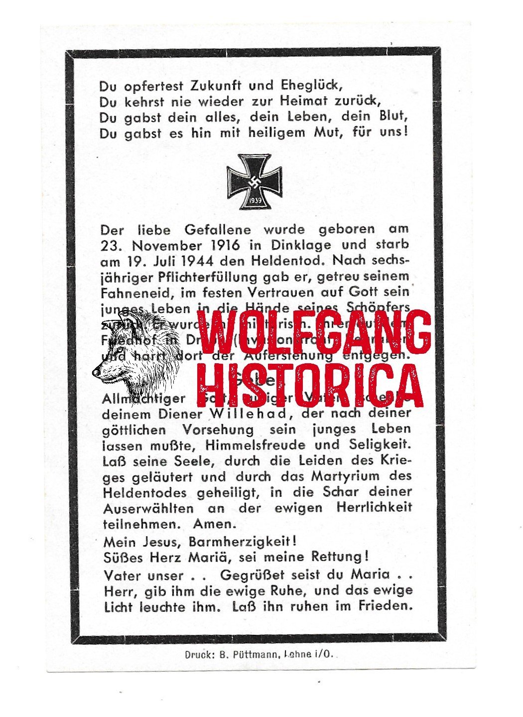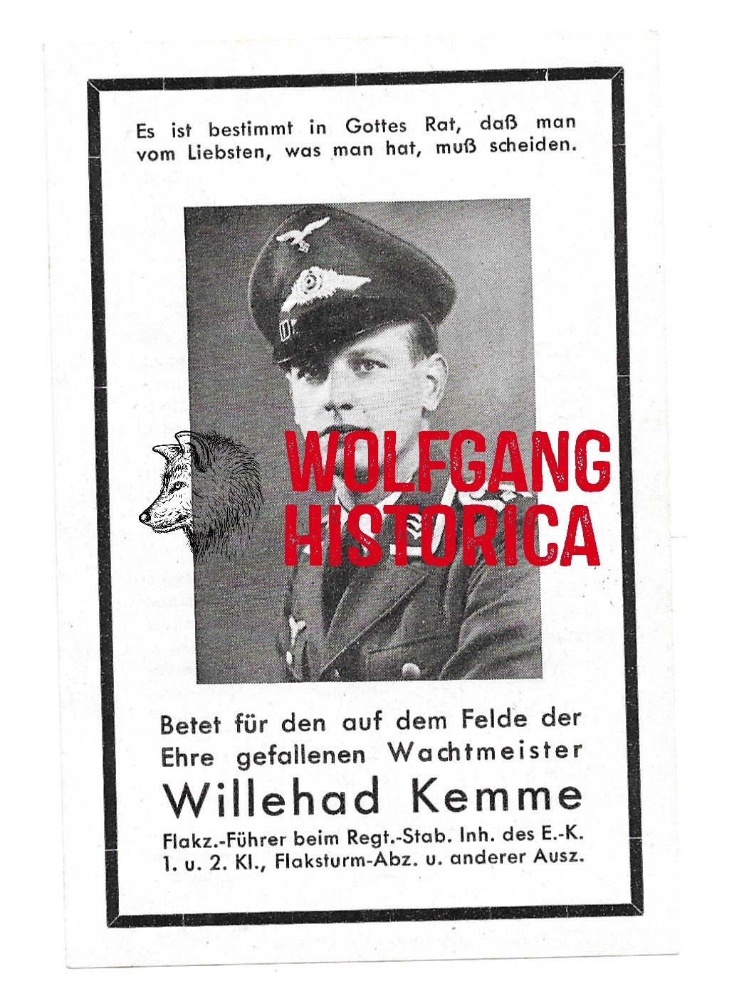 Original Death Card (“Sterbebild”) of Feldwebel Willehad Kemme. Flakzugführer. Earned several awards and was Killed in Dreux in Normandy. Condition as seen.