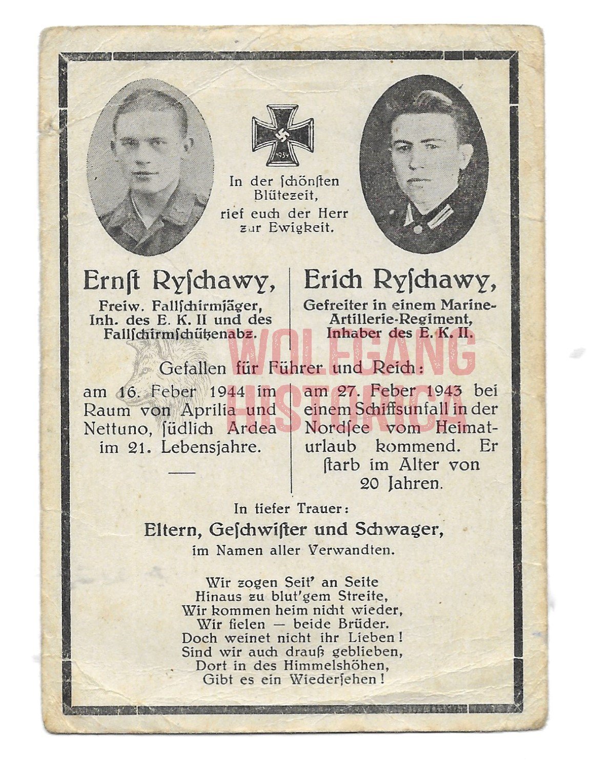 Death Card the brothers Ryschawy. Ernst Ryschawy served in the 6. Kompanie/ Fallschirmjäger-Regiment 11, when he was Killed in Action on February 6, 1944 in the Moletta-Abschnitt at Nettuno, Italy. His brother, Erich, served with the Marine-Artillerie-Abteilung 510 when he drowned in a ship accident.