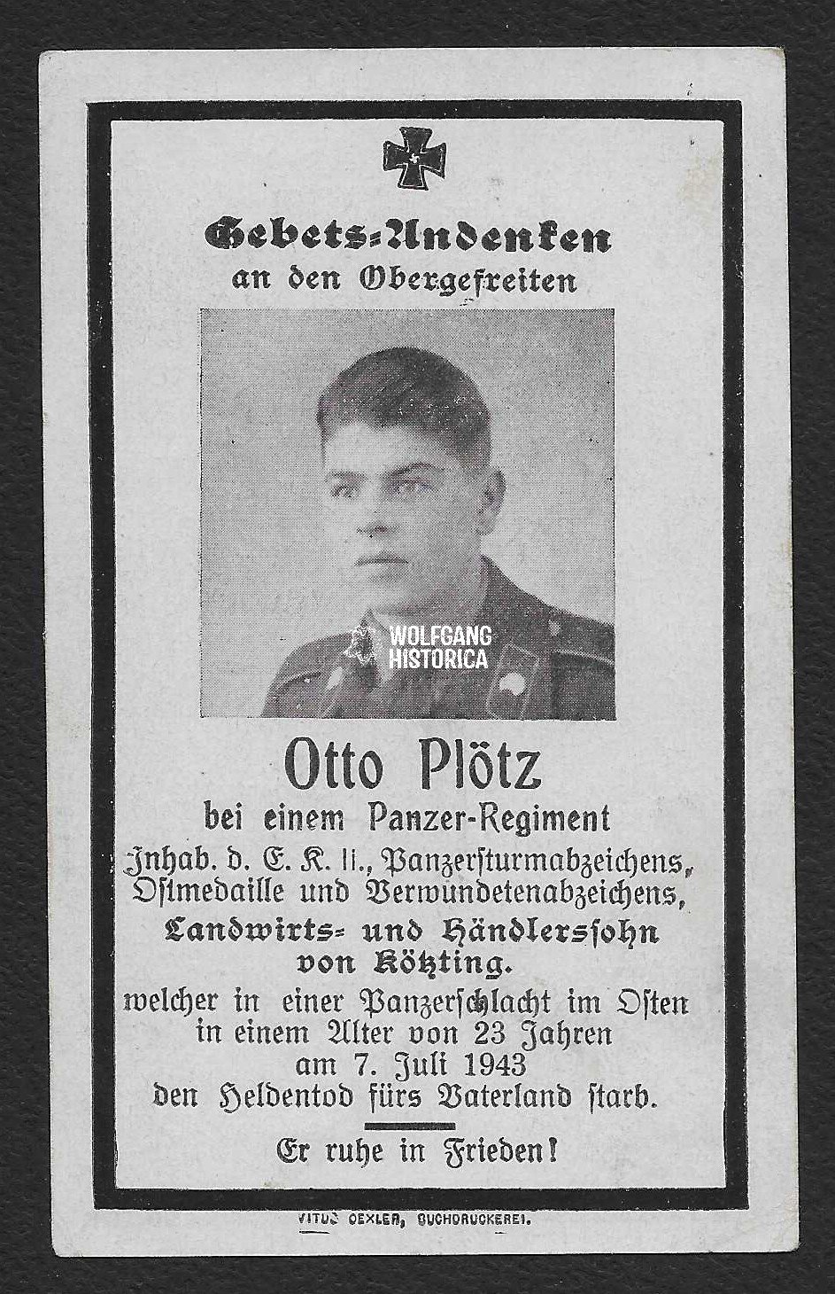 Original German Death Card for a soldier, serving with the Panzer-Regiment 3, who was Killed in Action during the Battle of Kursk. Condition as seen.