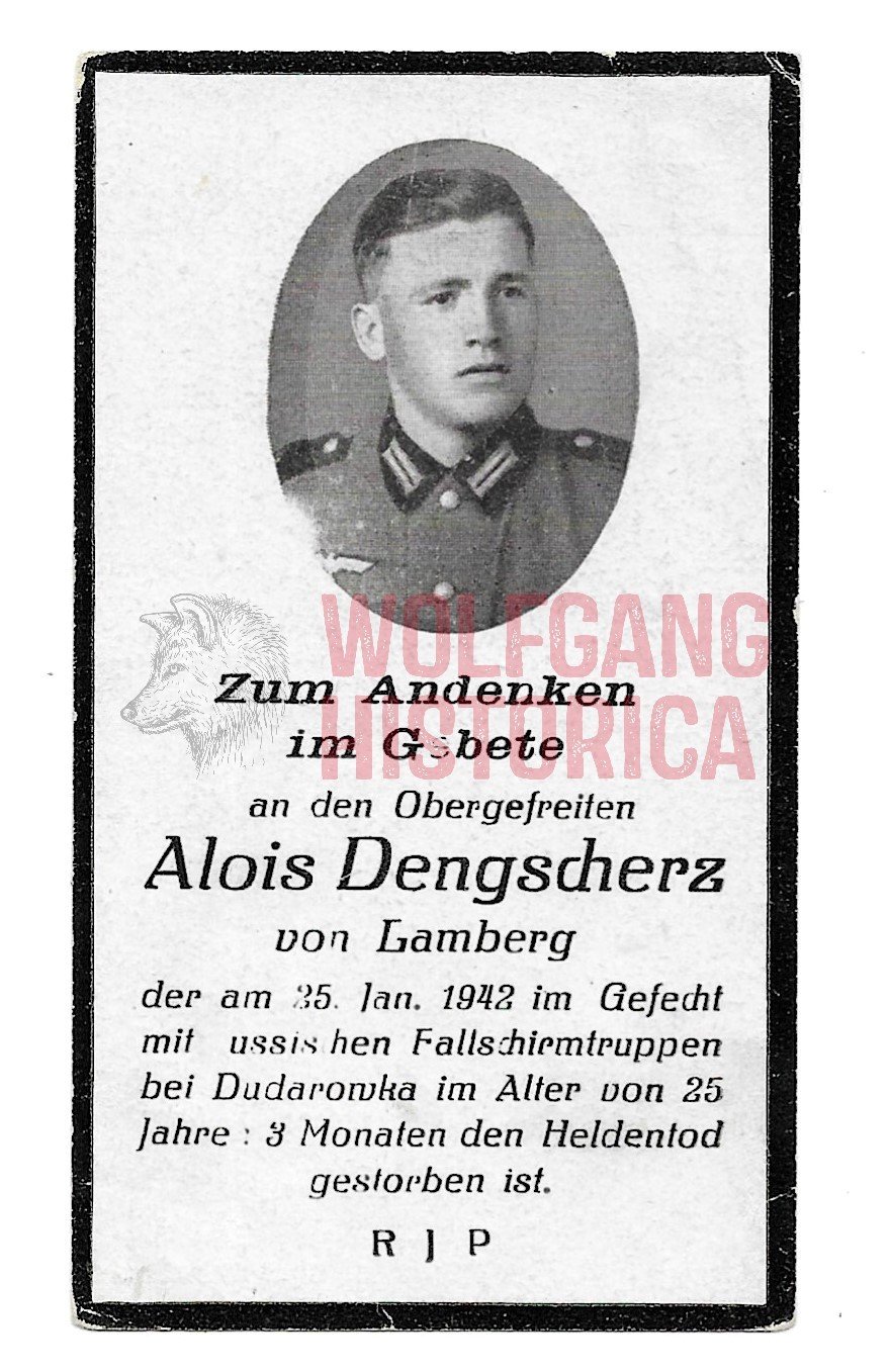 Death Card of Obergefreiter Alois Dengscherz, who served in Infanterie-Regiment 41, when he was Killed in Action on January 25, 1942 at Dudarowka against Soviet Paratroopers. (Death notification info card is illustration only)