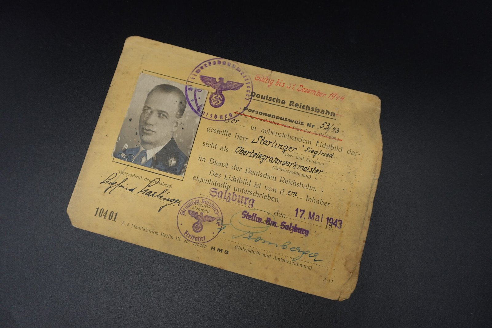 Original Deutsche Reichsbahn – Personenausweis from 1943 for a Obertelegrafenwerkmeister in Salzburg. Complete with photo. Issued in May 1943. Condition as seen.
