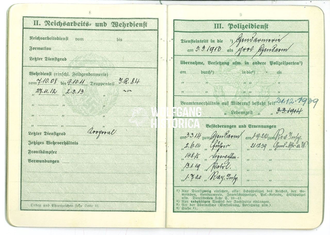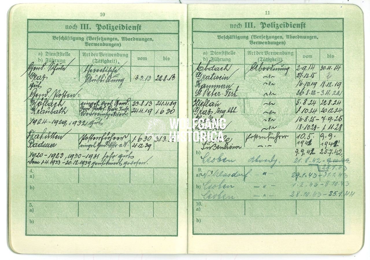Shows his long career within the Austrian/German police apparatus, culminating in his rank as Gendarmerie-Meister