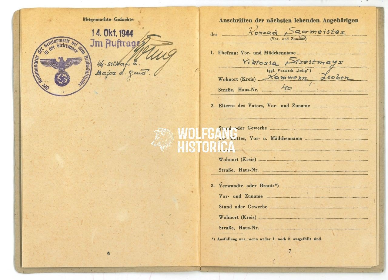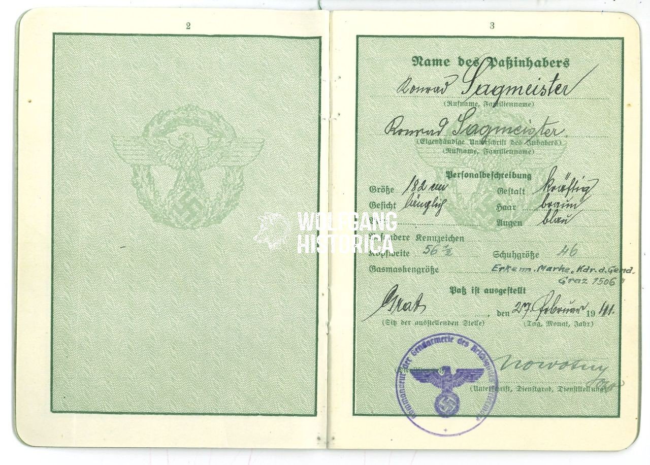 A rarely encountered dual-document set to long-serving Gendarmerie-Meister Konrad Sagmeister, born 21 November 1887 in Kammern. This grouping contains both his original Polizei-Dienstpass and his SS-Soldbuch, making it a highly desirable early-career-to-WWII documentation set.